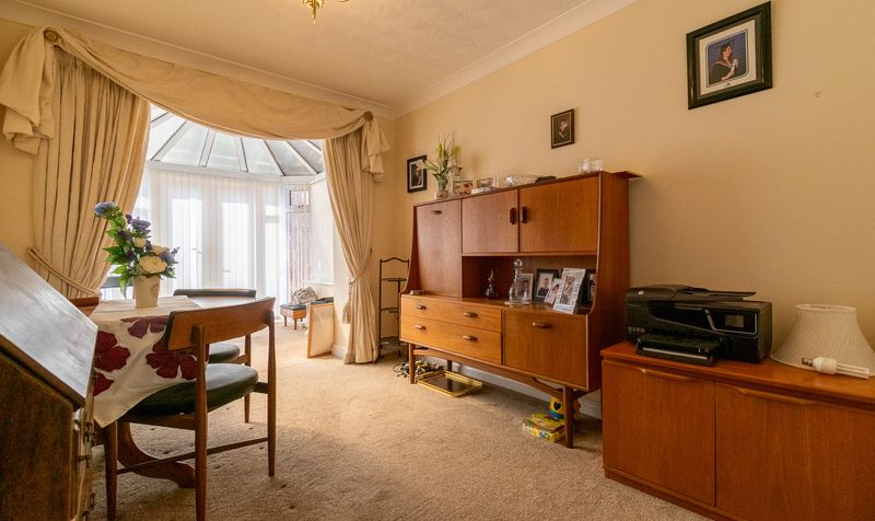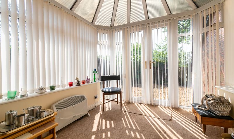 To the rear, a well-sized dining room offers the perfect setting for both everyday meals and formal gatherings. This space flows seamlessly into the conservatory, which is flooded with natural light thanks to its expansive windows and glass roof. French doors open onto the garden, providing a peaceful spot to enjoy the outdoors.