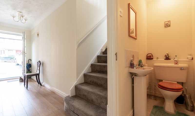 Inside, you’re welcomed by a bright and spacious hallway with wood-effect flooring, neutral décor, and a convenient downstairs WC. The hallway leads into a generous front lounge featuring a large bay window and a central fireplace. Neutrally decorated and filled with plenty of natural light, this is a fantastic-sized family room, ready for someone to move in and add their own personal touch.