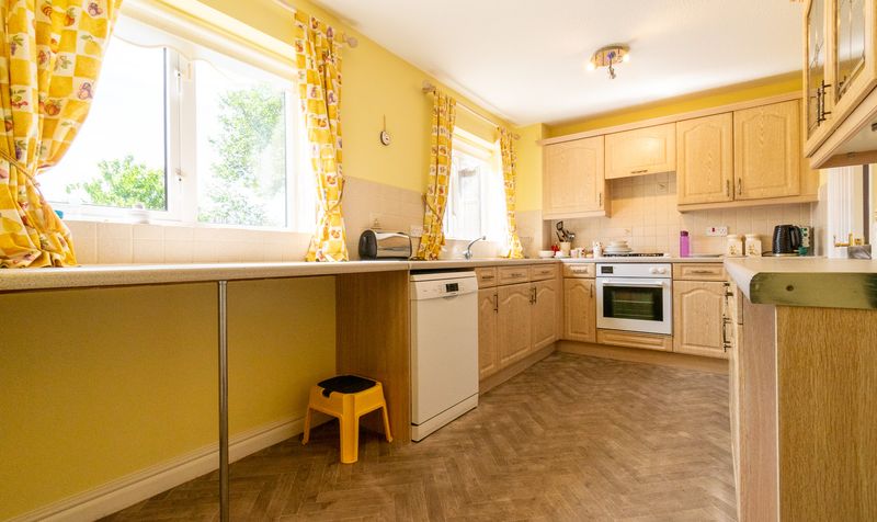 The kitchen is well-appointed with traditional wood-effect units, integrated appliances, and ample worktop space. Dual-aspect windows ensure plenty of natural light, and there’s also a breakfast area with pleasant garden views.