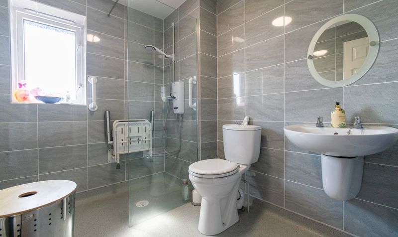 A contemporary family bathroom serves the rest of the accommodation, finished in sleek grey tiling and equipped with a walk-in shower, WC, pedestal basin, and thoughtful accessibility features including a shower seat and grab rails.