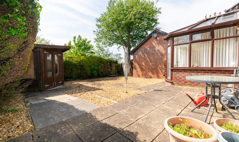 The rear garden is designed for low-maintenance living and outdoor enjoyment. A spacious patio is perfect for al fresco dining, while a gravelled area with a central circular feature and mature tree adds charm. A timber garden room provides additional storage or a potential hobby space, all enclosed by mature hedging for excellent privacy.