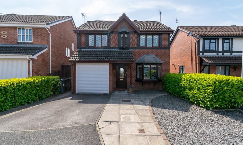 The property immediately impresses with its attractive double-fronted façade, traditional leaded windows, and neatly maintained front garden. A block-paved path leads to the entrance, while the wide driveway provides ample off-road parking and access to the integrated garage-ideal for additional storage or potential conversion into further living space.