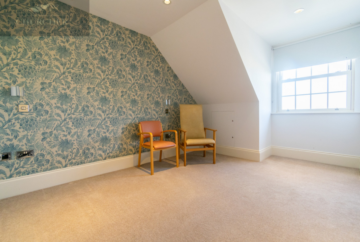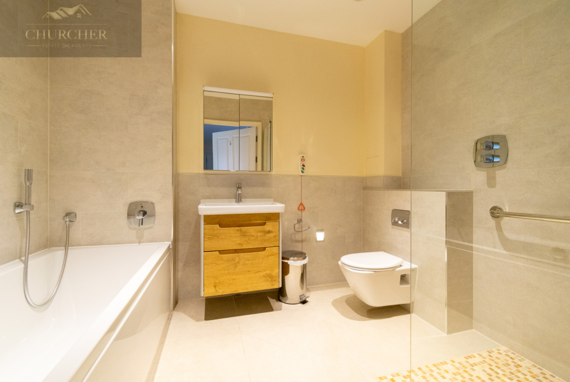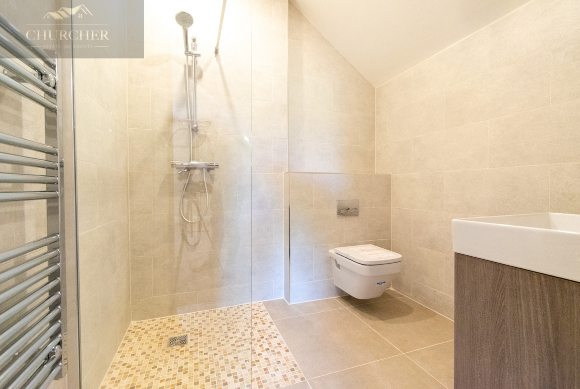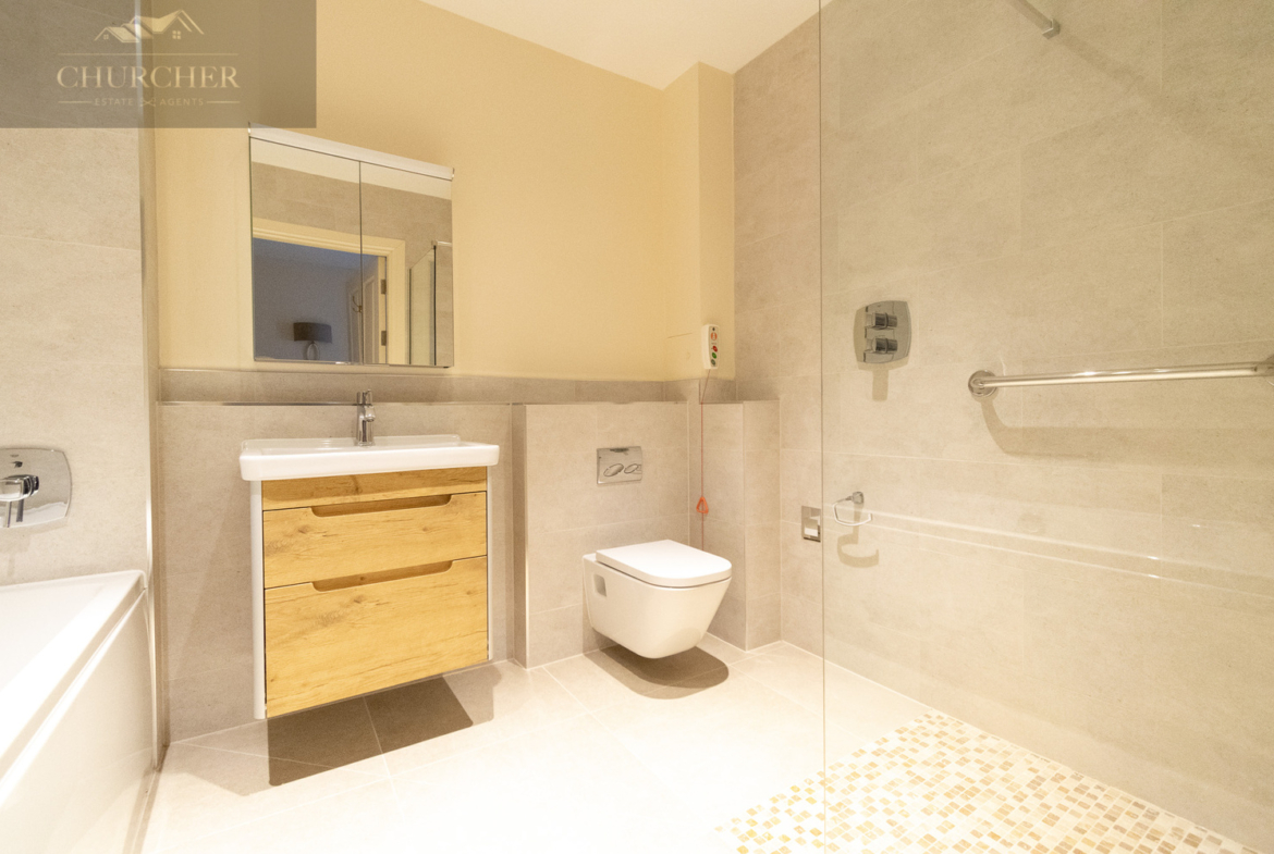 The property offers two double bedrooms, both well-sized and naturally bright. The primary bedroom benefits from built-in storage and plenty of natural light. A second bedroom, a wonderful versatile room – ideal as a home office, study, or even a dressing room. The main bathroom features a full-sized bath with shower over, wash basin, and WC, providing practicality alongside modern design.