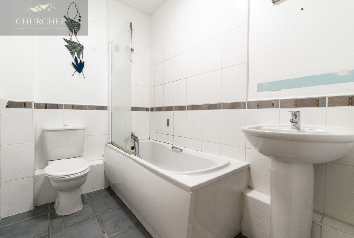 Completing the interior is the modern family bathroom, fitted with a white three-piece suite including a bath with shower over, wash basin and WC, finished with clean tiling and a bright, fresh feel.