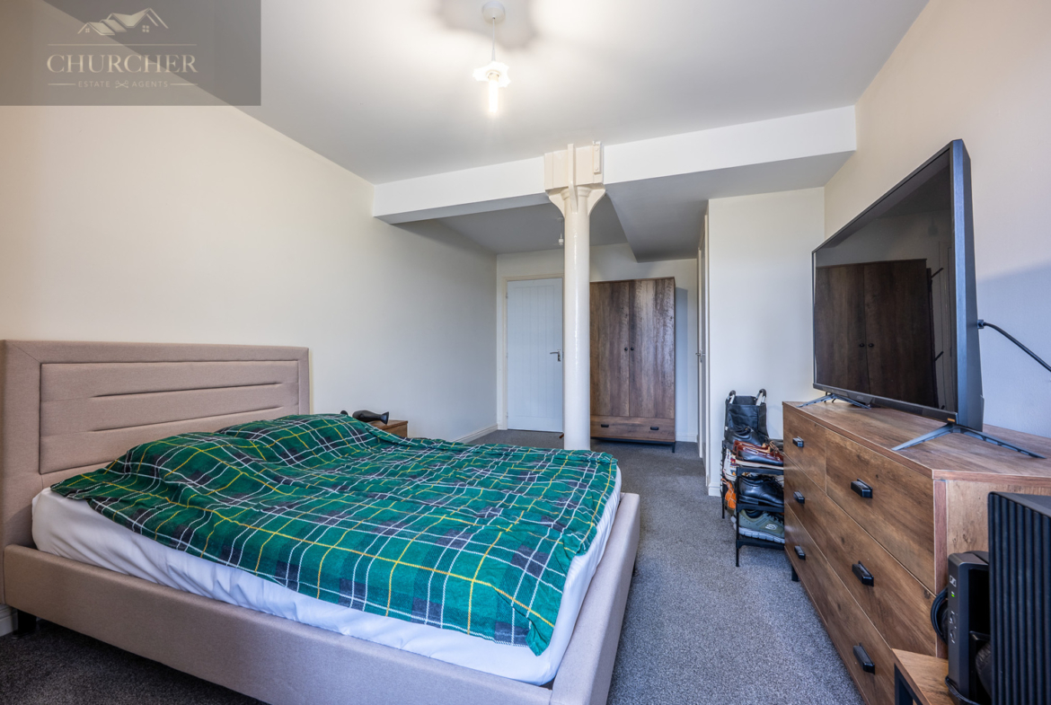 The principal bedroom is located towards the rear of the apartment and is an impressive double room with a distinctive industrial-style pillar and beam, adding character and charm. It is well-proportioned and features a walk-in area ideal for wardrobes or dressing, as well as access to a private en-suite shower room, complete with tiled walls, modern fittings, and a glass shower enclosure.