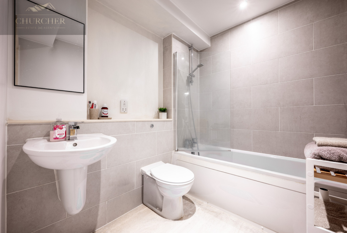 The second bedroom, also a comfortable double, is decorated in neutral tones and enjoys plenty of natural light through the large rear-facing window. It’s ideal as a guest bedroom, home office or nursery, depending on your needs.