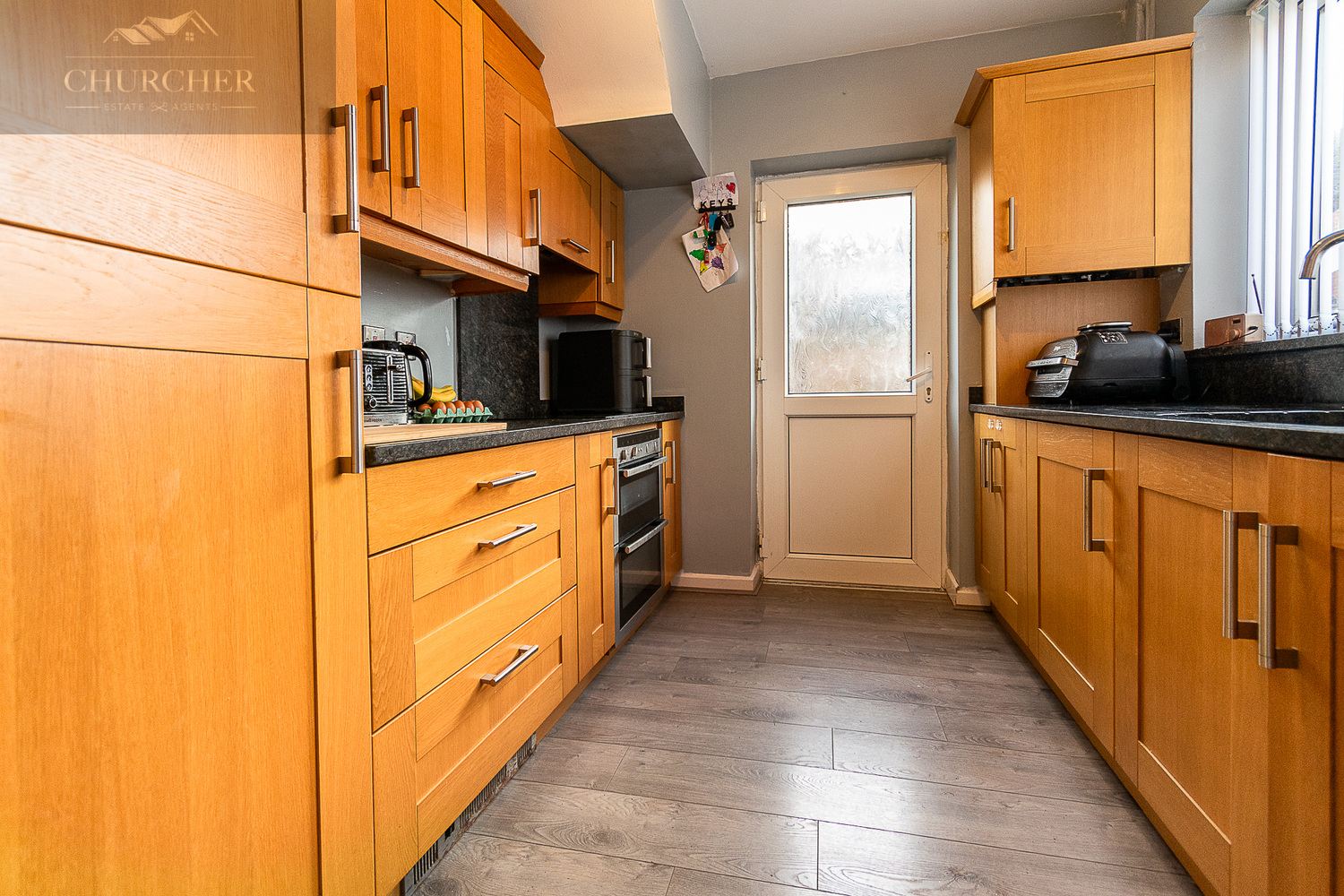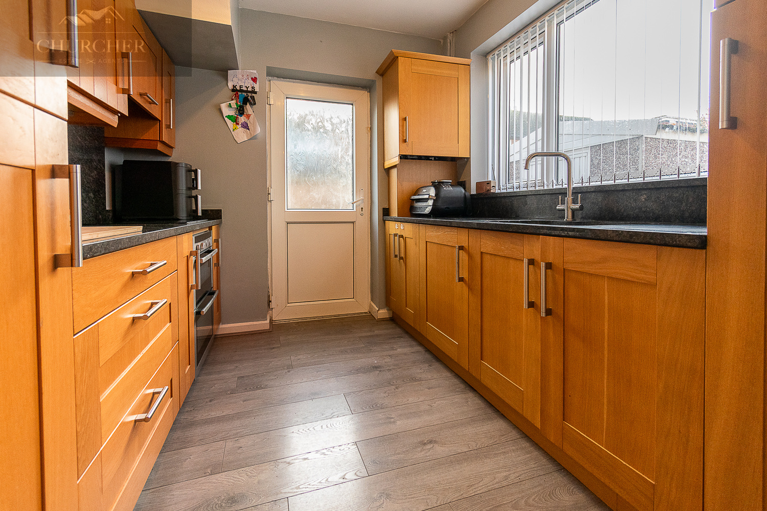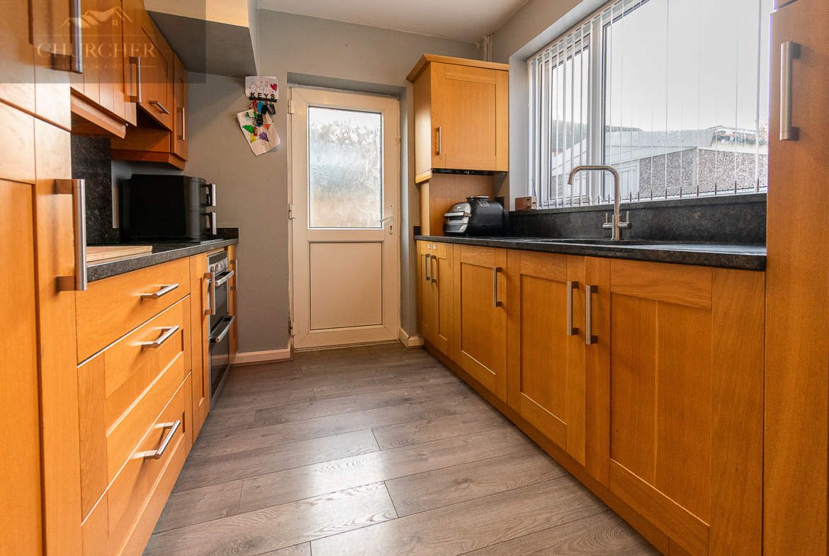 The kitchen offers a well-appointed range of fitted cabinets and generous worktop space, finished in warm tones that complement the rest of the home’s styling. Practical, functional, and with direct access to the rear garden, it caters perfectly for everyday use and outdoor dining during the warmer months.
