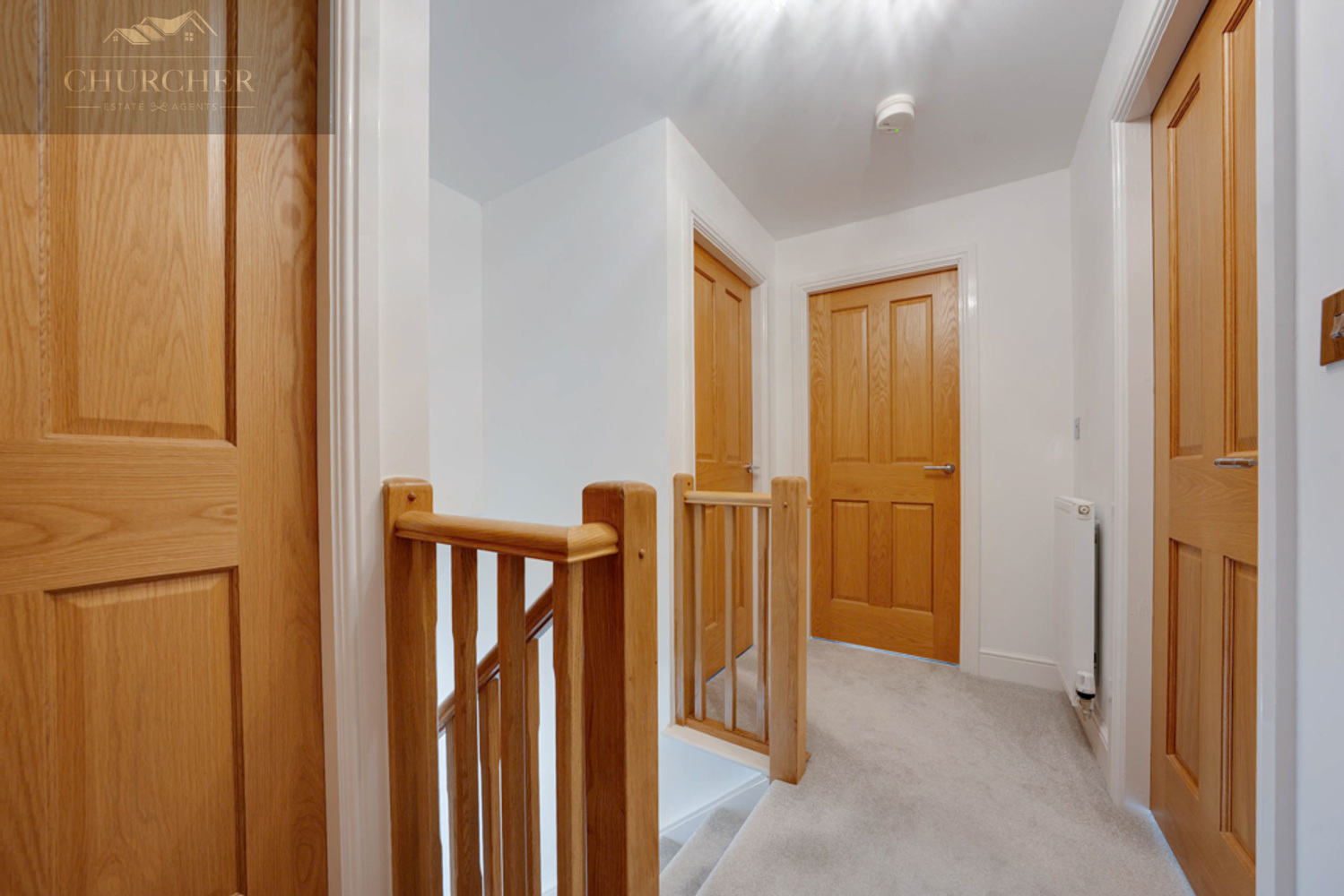 The landing is spacious and airy, with two separate built-in storage cupboards ideal for linens and household items, and oak doors leading to each of the rooms.