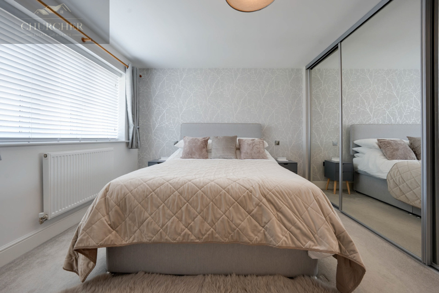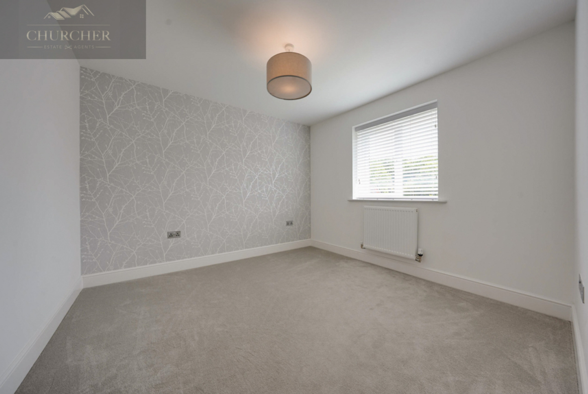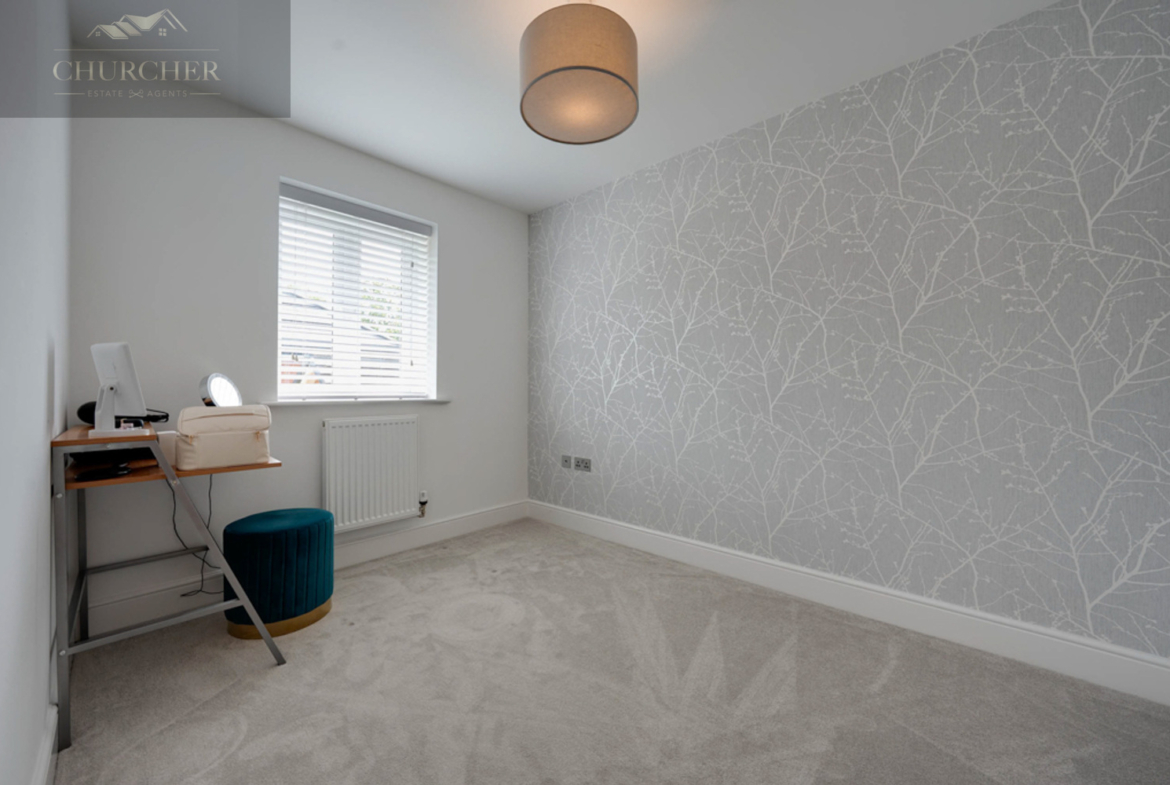 The third bedroom offers generous proportions, plush carpeting, and a striking wallpapered feature wall, making it perfect for a child’s room, second office, or additional guest space. The fourth bedroom is equally bright and adaptable, well-suited to use as a single bedroom, nursery, dressing room or hobby space.