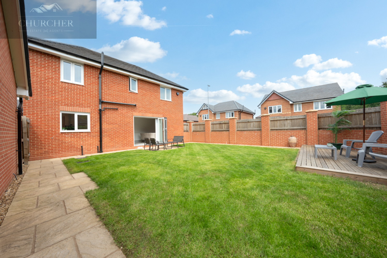 Outside, the rear garden is private, enclosed, and designed with both families and entertaining in mind. A neatly maintained lawn provides space for children or pets, while a raised decked seating area is perfect for al fresco dining, summer BBQs or simply relaxing in the sun. To the side, a detached garage and block-paved driveway offer ample off-road parking and excellent additional storage.