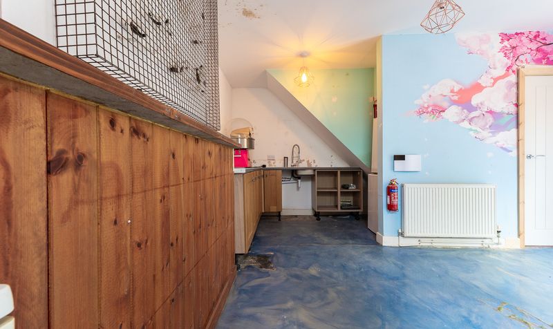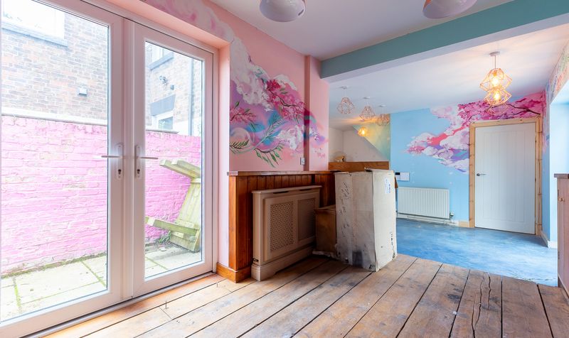Stepping inside via the private front door off Aughton Street, you are welcomed into a small entrance lobby that opens directly into the heart of the home. The ground floor unfolds into a surprisingly spacious and quirky open-plan kitchen/diner. Full of personality, this vibrant space features hand-painted murals, timber wall panelling, and an eye-catching blue floor that adds an artistic flair. The kitchen area includes fitted cabinetry, a sink positioned beneath the stairs, and space for freestanding appliances. At the front of the property, the dining section benefits from patio doors opening out to the pavement, offering exciting potential for a business venture or alternate access to the ground floor.