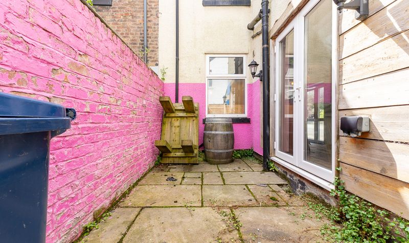 Outside, the home enjoys a compact yet private rear courtyard, enclosed by a vibrant pink-painted brick wall and finished with stone paving. This charming outdoor spot offers a peaceful retreat right in the centre of town.