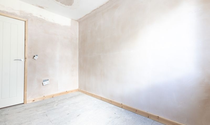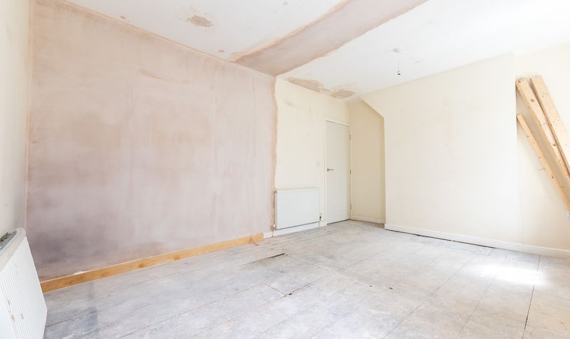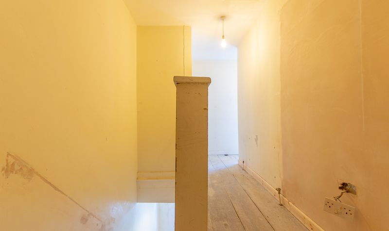 The staircase, accessed from the entrance lobby, leads to a spacious first-floor landing that connects all three bedrooms and the bathroom. To the rear, the principal bedroom is impressively sized and filled with natural light from two windows. Recently plastered, it provides a blank canvas ready for decorating. The second bedroom at the front is also generous in size and has been similarly plastered, ready for finishing. The third bedroom sits centrally and would be ideal as a nursery, home office, or guest room.