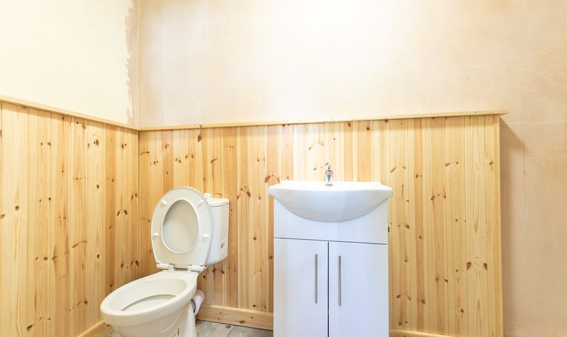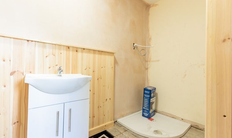The family bathroom sits between the rear bedrooms and has been partially renovated. It features wood panelling, a modern white vanity unit and WC, and a dedicated space for a walk-in shower, allowing the next owner to complete the room to their own taste.