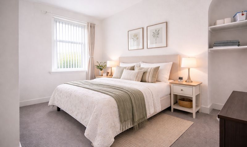 The ground floor also accommodates two well-proportioned bedrooms, each beautifully presented with large windows allowing plenty of light, high ceilings, and space for double beds and furniture. The rooms are neutrally finished, making them inviting and easy to personalise.