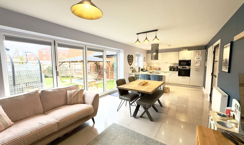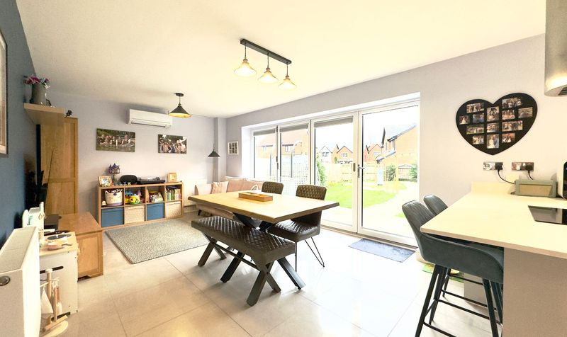 The dining and family area flows seamlessly from the kitchen, offering plenty of space for a large dining table and relaxed seating. Air conditioning ensures comfort throughout the year, while wide bifold patio doors span the rear elevation, flooding the room with natural light and creating a seamless connection to the garden. When opened, these doors extend the living space outdoors, ideal for summer entertaining and family gatherings.