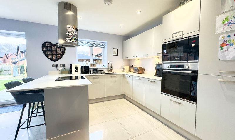 Moving through to the rear, the home opens into an impressive open-plan kitchen, dining and family area which forms the heart of the property. Designed for modern family living, this generous space combines contemporary style with everyday practicality. The kitchen is fitted with sleek cabinetry and finished with quartz worktops, complemented by a Quooker tap providing instant boiling water. An under-counter drinks fridge adds a touch of luxury, making the space perfect for entertaining. Integrated appliances and ample worktop space ensure the kitchen is both functional and visually striking.