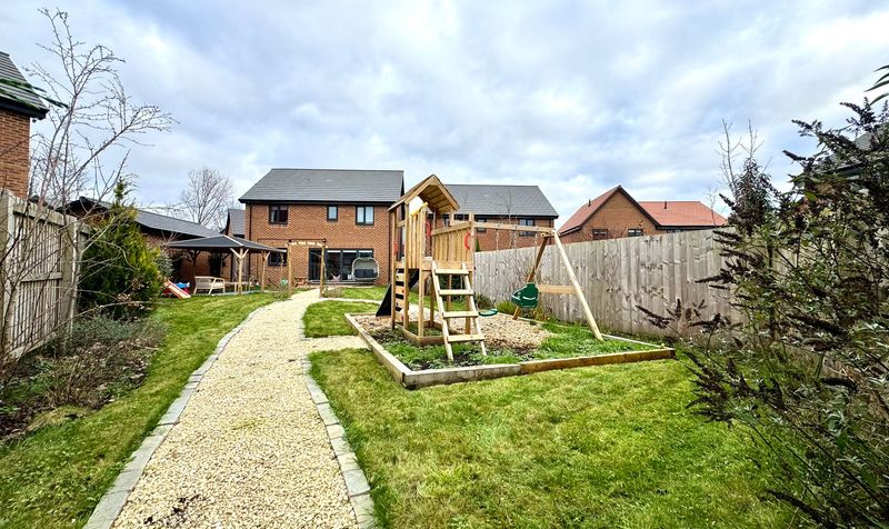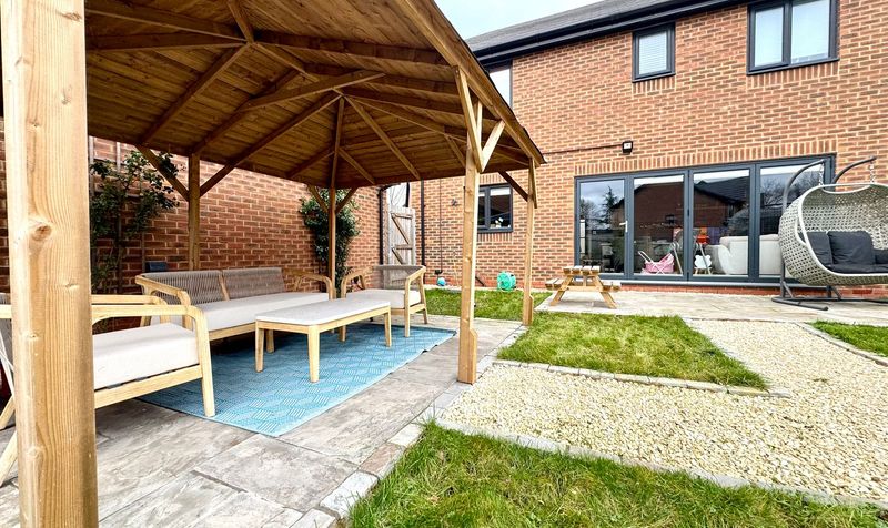 Externally, the property continues to impress. To the front, a neat approach and driveway provide off-road parking, while the rear garden is a real highlight. Thoughtfully landscaped, the garden offers a paved patio directly accessed from the bifold doors, ideal for alfresco dining. Beyond, the garden opens out into lawned areas with gravel pathways and a charming timber gazebo providing a sheltered seating area, perfect for relaxing or entertaining throughout the seasons. The garden is both private and family-friendly, offering a wonderful outdoor extension to the home.