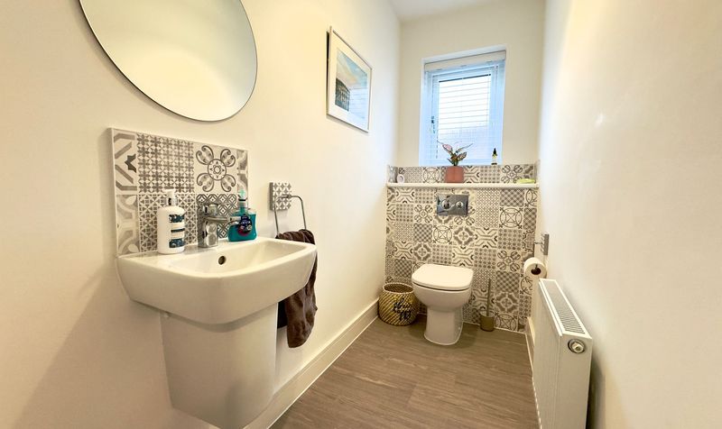 Just off the kitchen is a well-appointed utility room, finished to the same high standard with quartz worktops and additional storage, providing a practical and discreet space for laundry appliances. A contemporary ground floor WC completes the downstairs accommodation.
