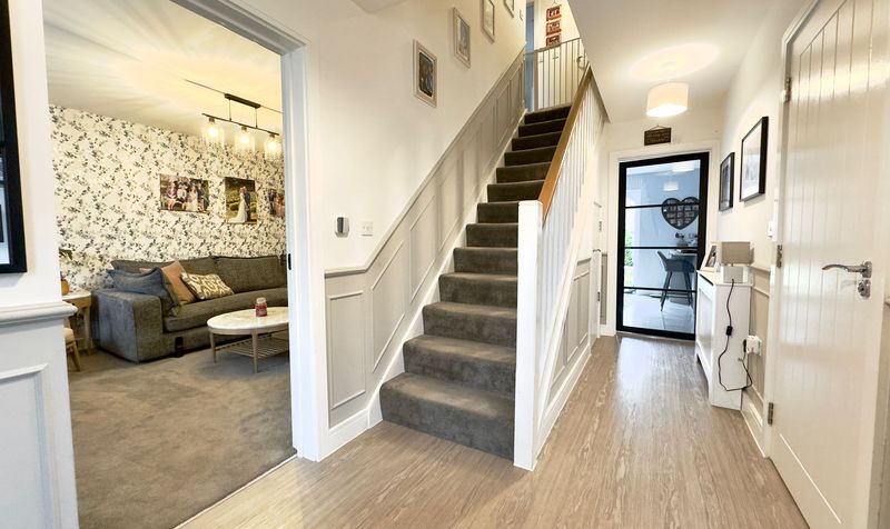 Upon entering the property, you are welcomed into a bright and inviting entrance hallway, finished with attractive wood-effect flooring and elegant wall panelling that immediately sets a refined tone. The staircase rises centrally, softened by plush carpeting, while doors lead off to the main living spaces. The layout feels both practical and welcoming, with a clear sense of flow through the ground floor.