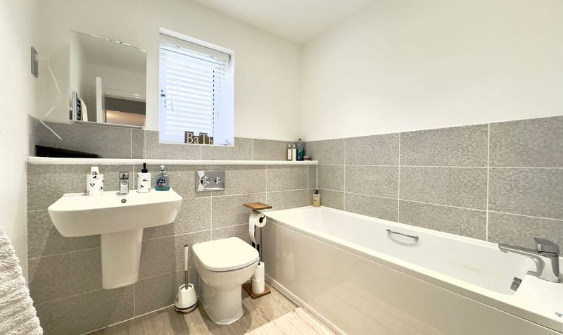 The family bathroom is finished in a modern, neutral style and features a full-sized bath with overhead shower, complemented by clean-lined tiling and contemporary sanitaryware.