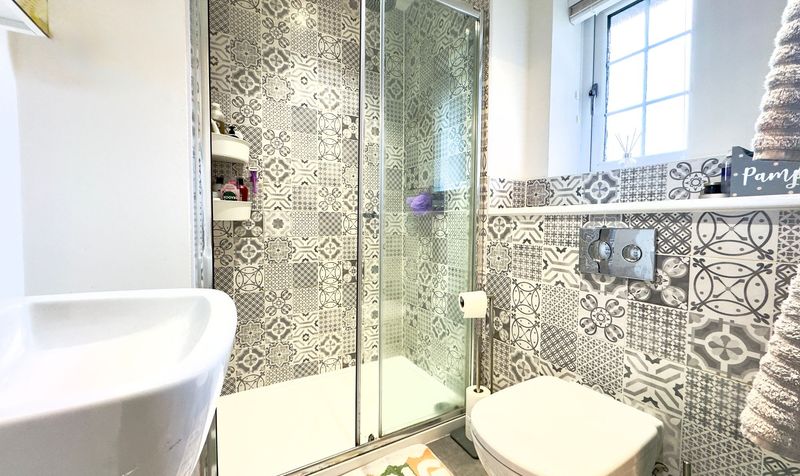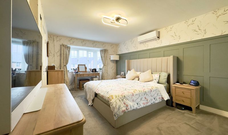 The first floor continues the sense of space, with a generous landing giving access to all four bedrooms and the family bathroom. The main bedroom is a standout feature, offering a beautifully finished and tranquil retreat. Air conditioning provides year-round comfort, and the room is served by a stylish en-suite shower room, finished with contemporary tiling and modern fittings.