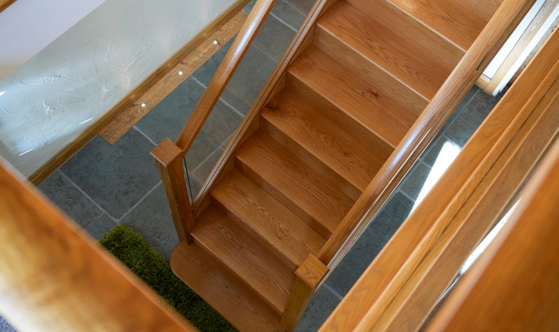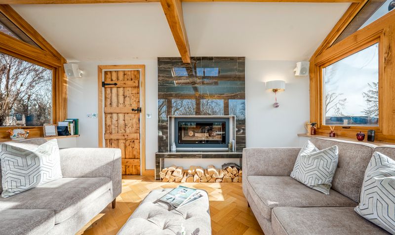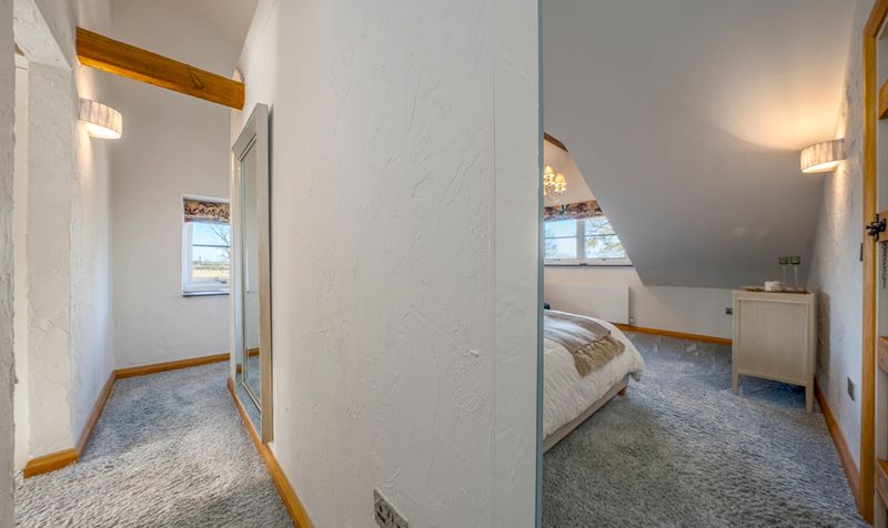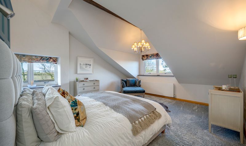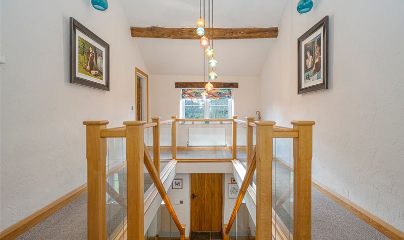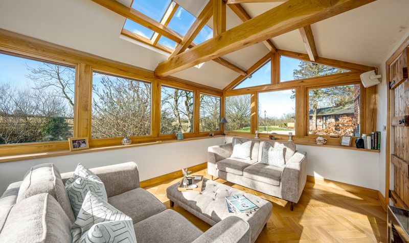 From the kitchen, you step into the main hallway, where a striking feature staircase takes centre stage, elegantly framed by symmetrical floor lighting. To the left, the first reception room provides a cosy retreat, complete with an original feature fireplace that adds warmth and character. To the right, a bright and inviting second reception room flows seamlessly into a stunning orangery. Here, exposed oak beams harmonize with the elegant herringbone flooring, while expansive windows offer breath taking 180-degree views of the surrounding landscape and sunsets.