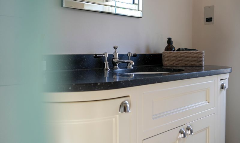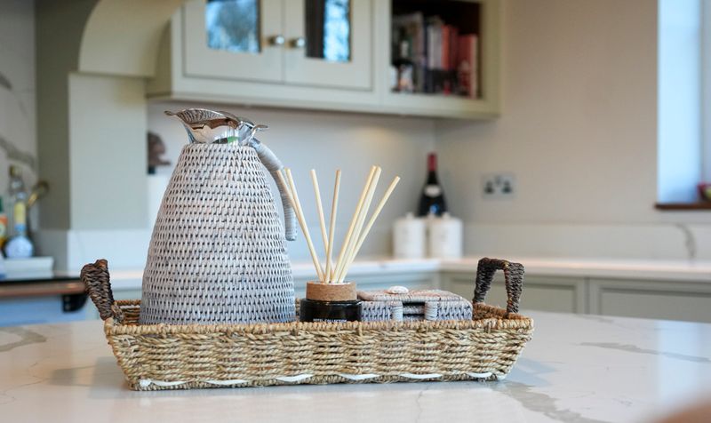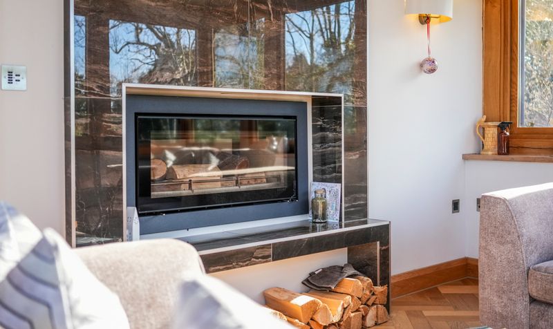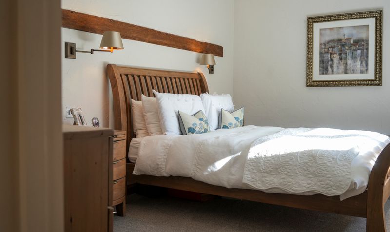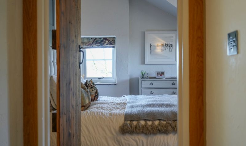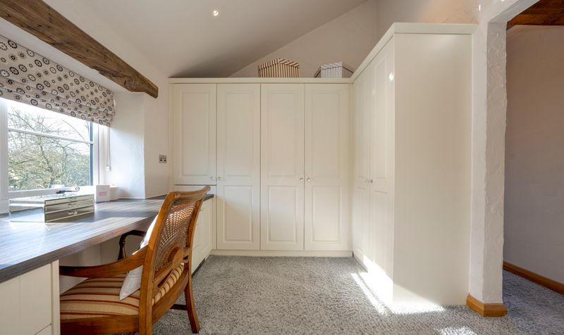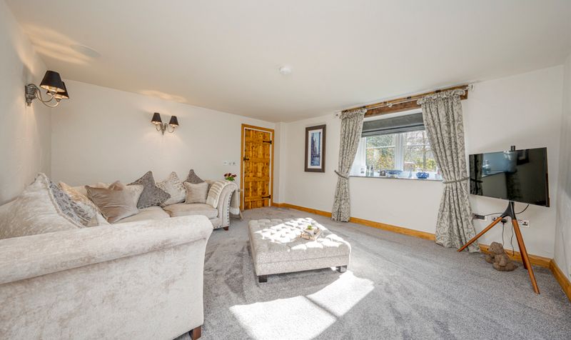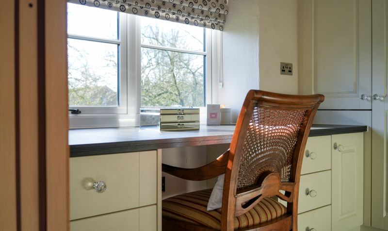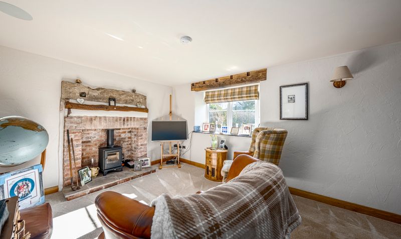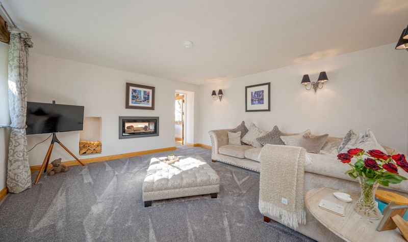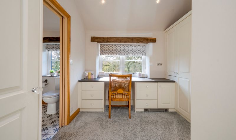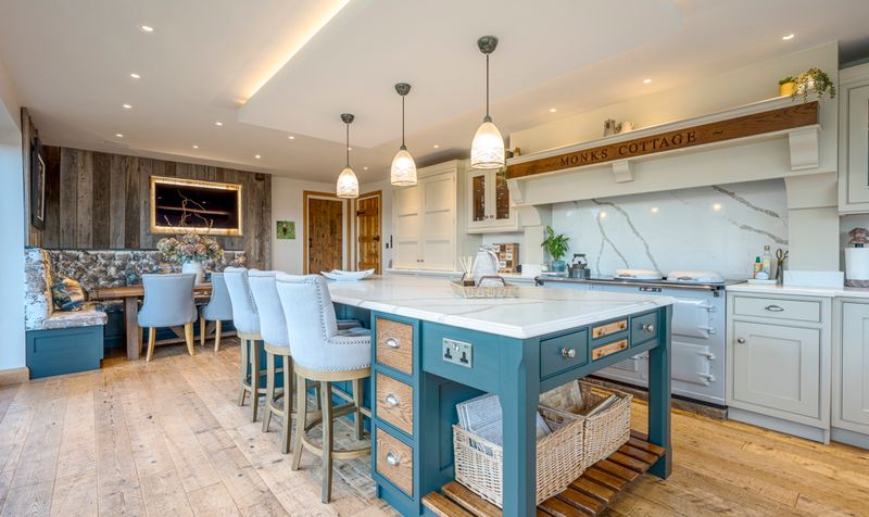 The bespoke, handcrafted Matthew Marsden kitchen defines the character of the home, featuring elegant cream cabinetry and marbled quartz worktops that beautifully contrast with the rustic wooden flooring and traditional oak doors. Designed for both style and functionality, the kitchen is equipped with an electric Aga and a Quooker tap for instant boiling water. This spacious and inviting area also includes a cosy dining space and casual seating around the island, making it the perfect hub for family gatherings and entertaining.