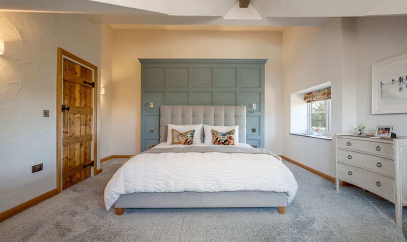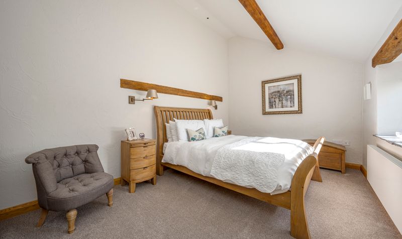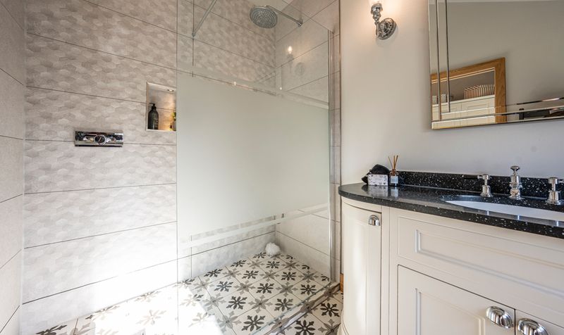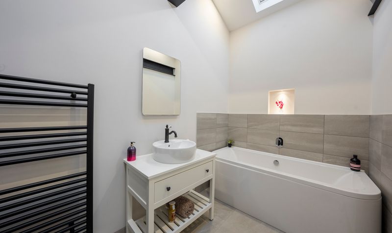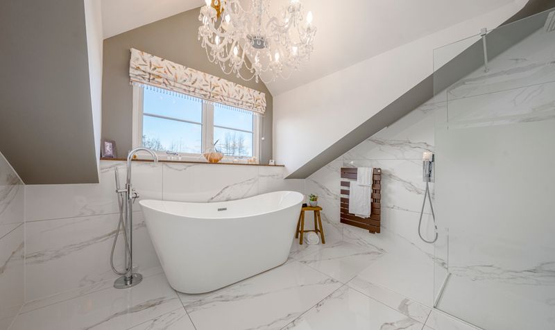 On the first floor, three generously sized bedrooms continue the modern farmhouse aesthetic, enhanced by charming wooden beams. The thoughtfully designed main bedroom boasts a hidden walk-in dressing room, discreetly tucked behind a false wall. This elegant space includes fitted wardrobes, seamlessly leading into a luxurious en-suite, complete with statement tiling and a spacious walk-in shower. The family bathroom is the perfect finishing touch to the first floor, featuring elegant white marble tiling and a showstopping chandelier suspended above a luxurious freestanding bath. This serene space exudes sophistication, creating a true spa-like retreat.