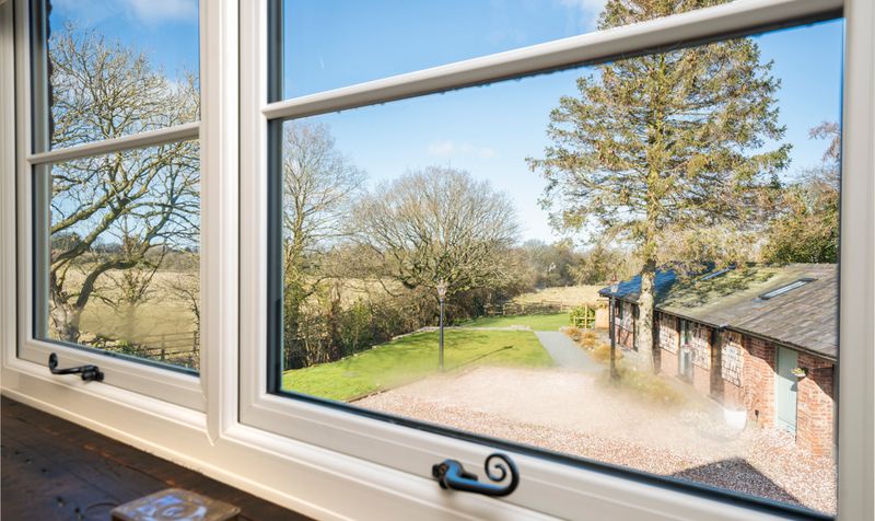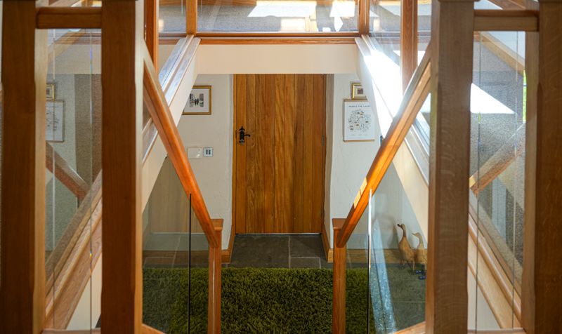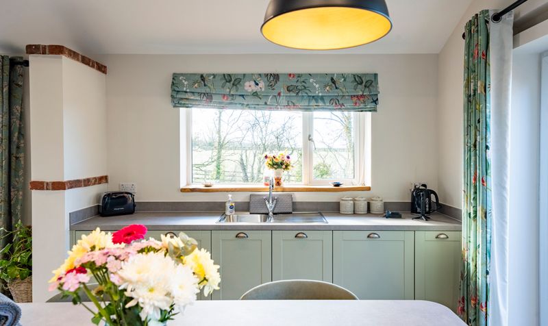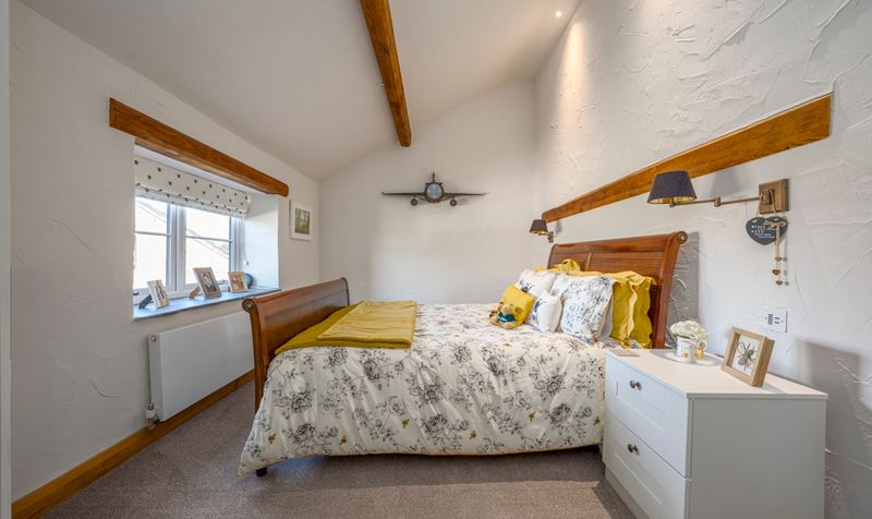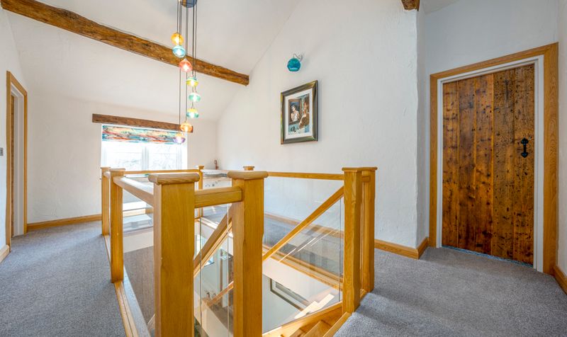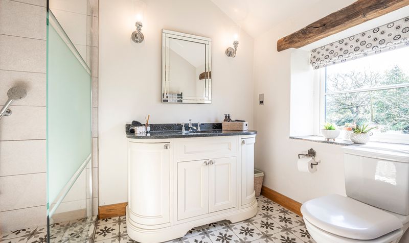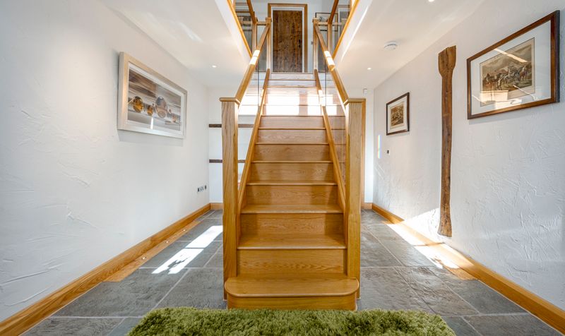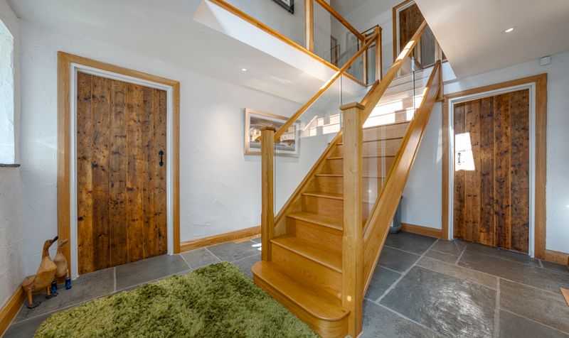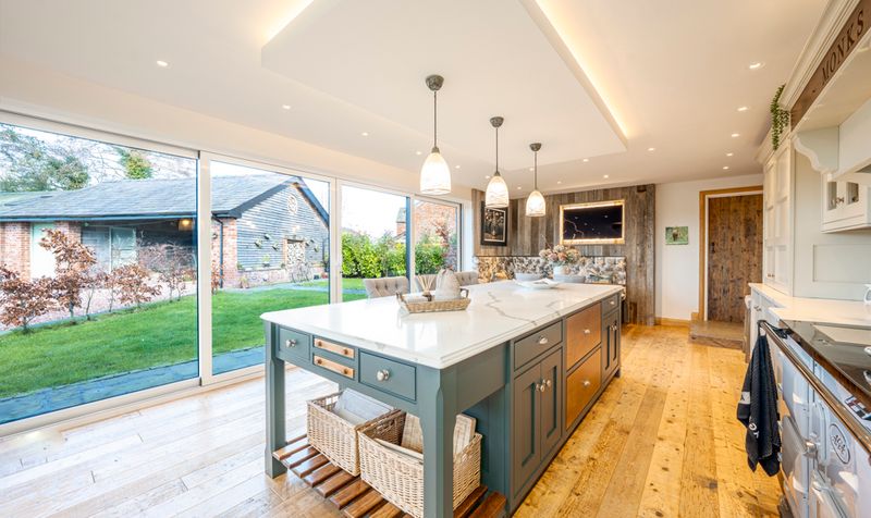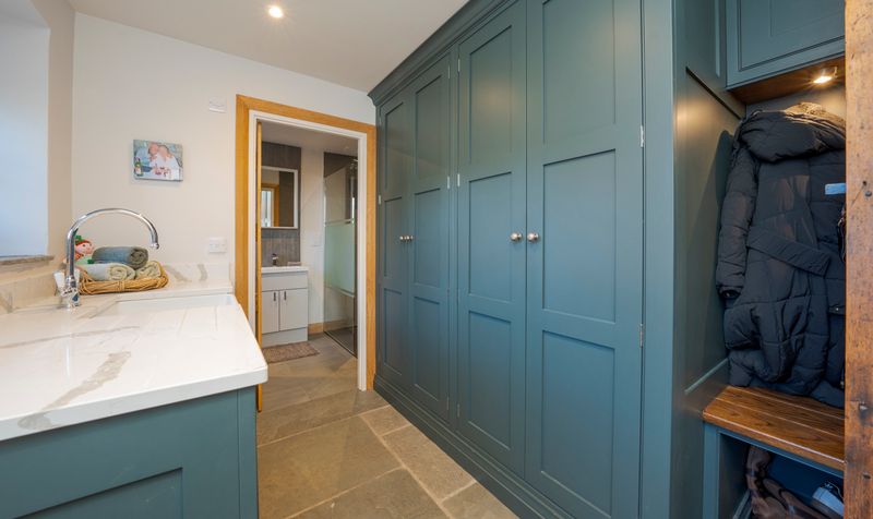 Upon entering, you are greeted by a stylish and functional utility and boot room, featuring elegant shaker-style fitted cupboards that provide ample storage. To the left, a beautifully designed downstairs bathroom boasts exquisite tiling and a spacious walk-in shower. Moving further into the heart of the home, the kitchen is a true masterpiece, seamlessly blending luxury and modern design with charming original rustic features. Upon entering you are met with stunning views over the landscape from the full length bi-folding doors.