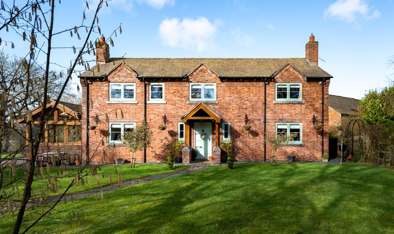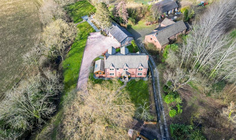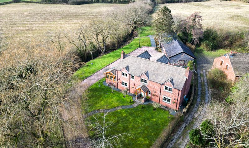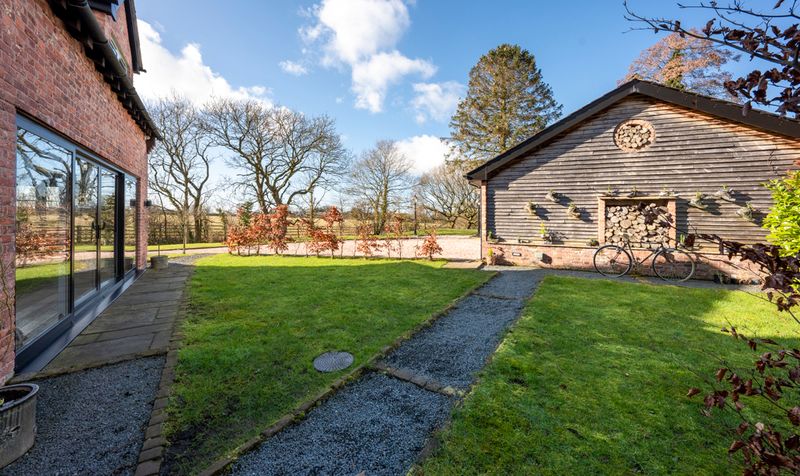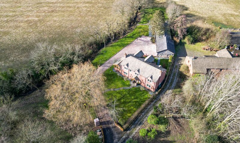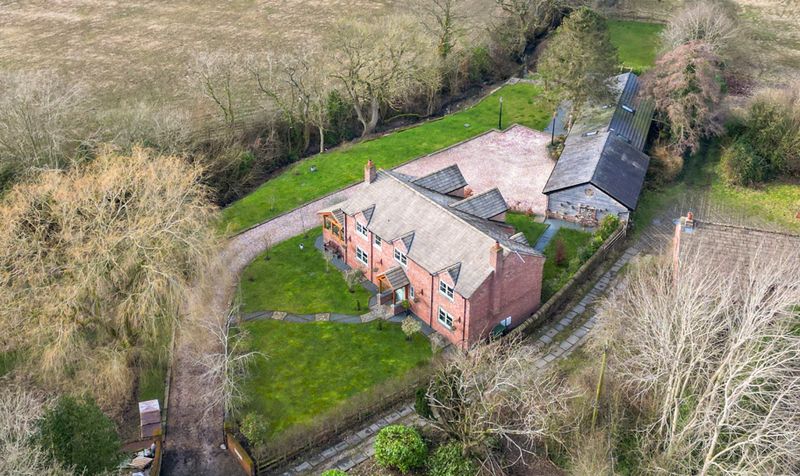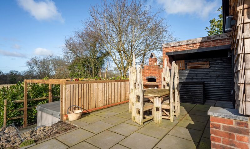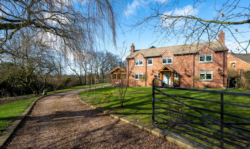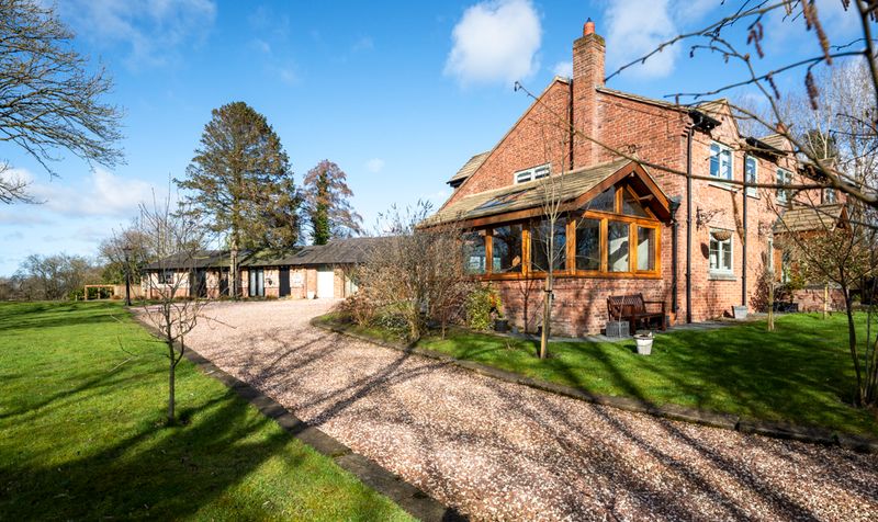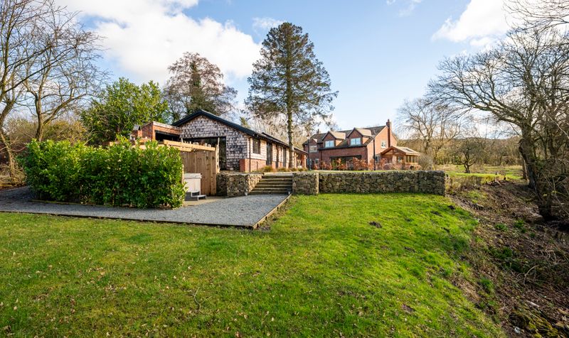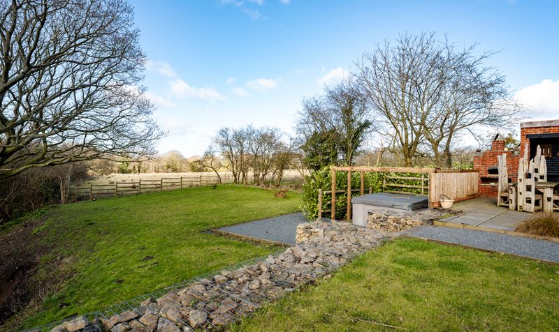 Externally the property also benefits from a large double garage and sweeping gravel driveway accommodating multiple vehicles. To the front the stunning symmetrical façade of the house features an oak beamed porch and quaint path leading to the front door is surrounded by picturesque front garden. A small brook runs down the side of the property leading to the rear garden. A few steps take you down to a private hot tub and laid garden outlined by trees and surrounded open fields, offering a tranquil and private retreat.