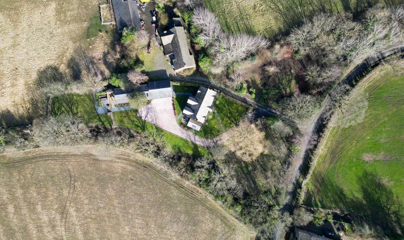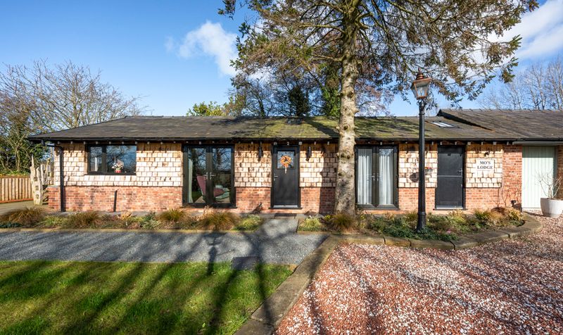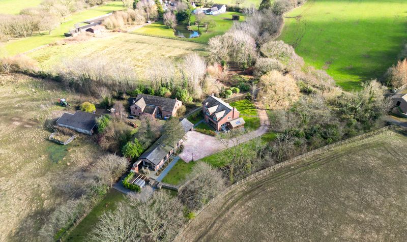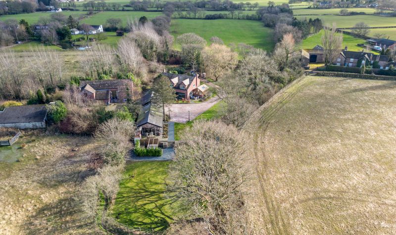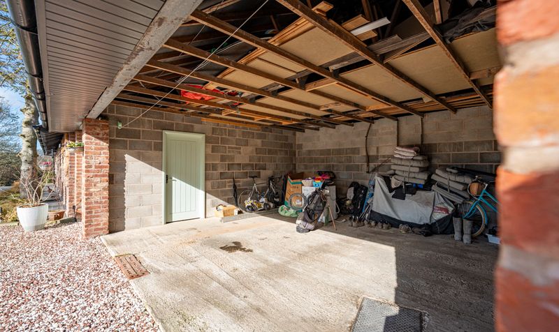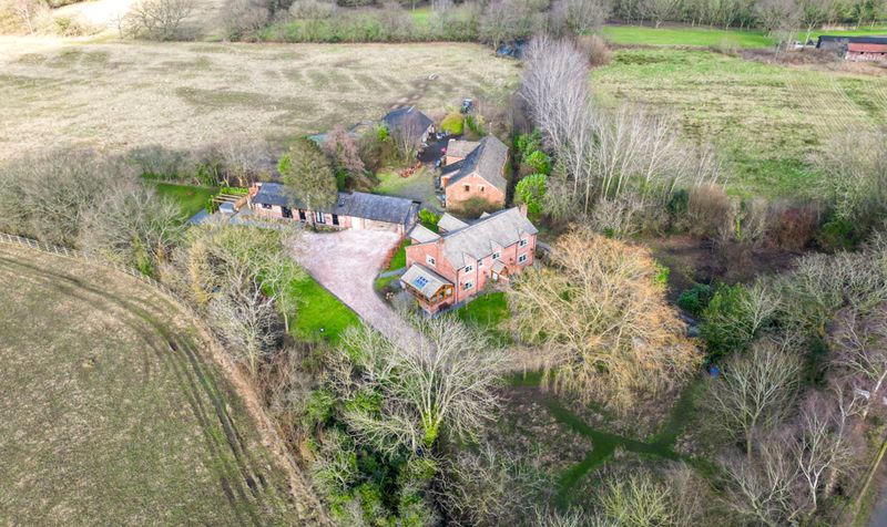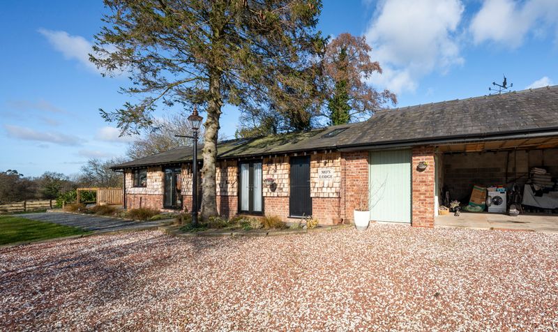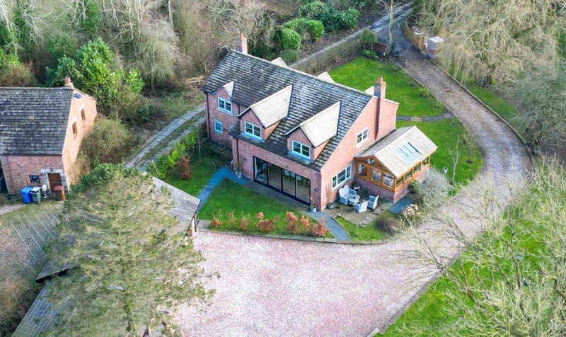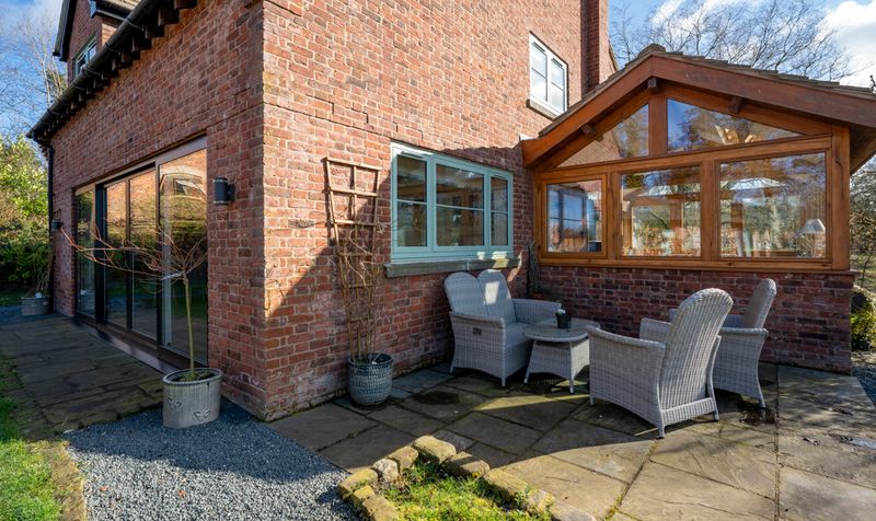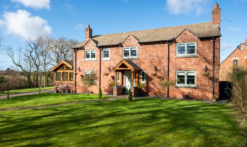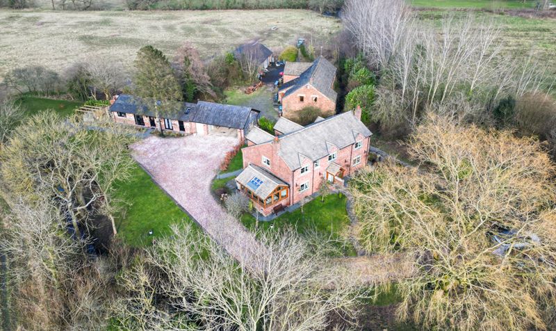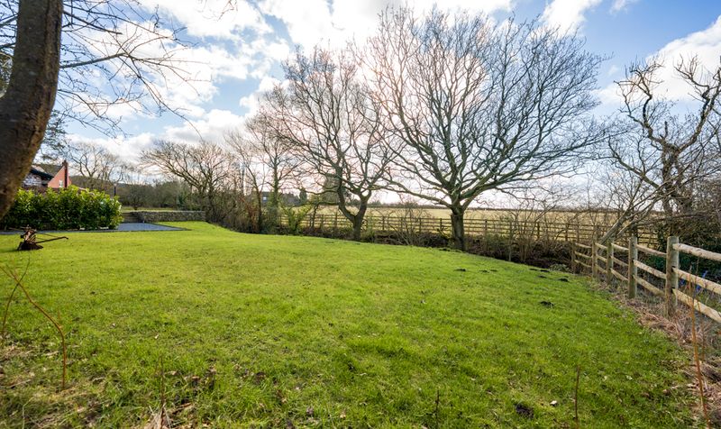 Externally the property also benefits from a large double garage and sweeping gravel driveway accommodating multiple vehicles. To the front the stunning symmetrical façade of the house features an oak beamed porch and quaint path leading to the front door is surrounded by picturesque front garden. A small brook runs down the side of the property leading to the rear garden. A few steps take you down to a private hot tub and laid garden outlined by trees and surrounded open fields, offering a tranquil and private retreat.