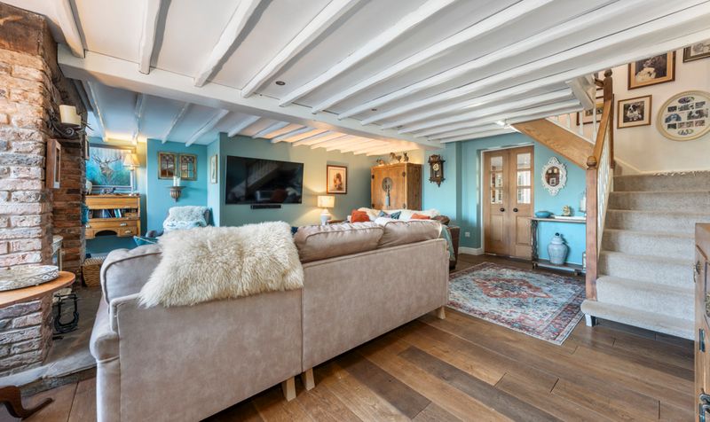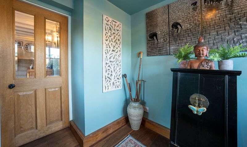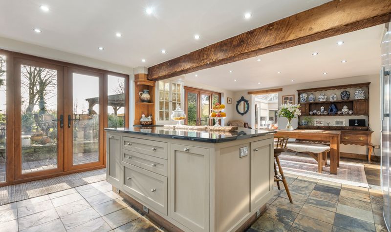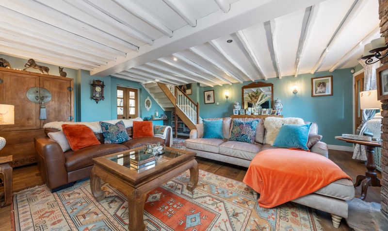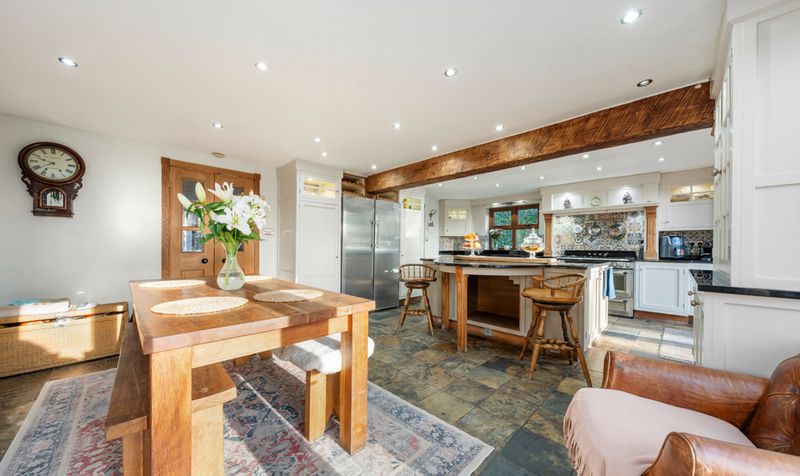 Moving through the living room, you find yourself in a delightful country kitchen diner. The kitchen embodies a warm and inviting atmosphere, characterized by its cream farmhouse vibes. A large Smeg range cooker stands prominently against one wall, its retro aesthetic adding a touch of charm while offering modern functionality. The cooker is complemented by a spectacular back splash of contrasting tiles that continue throughout the kitchen. Oak beams stretch across the ceiling, bringing a rustic touch to the room and creating a sense of warmth. The flooring consists of a classic flagstone, contributing to the cottage feel with additional benefit of underfloor heating.