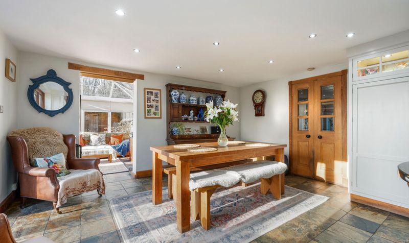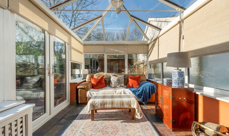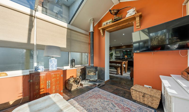 The conservatory is a bright and airy extension of the country cottage, designed to maximize natural light and provide a seamless connection to the outdoors. In one corner of the conservatory, a log burner adds a cosy element to the room.