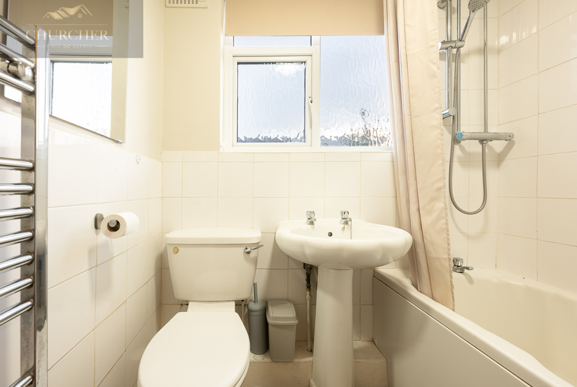 The bathroom is conveniently located off the hallway and is fitted with a full white suite including bath with shower over, wash basin, and WC. The frosted window provides both light and privacy, and the room is tiled for easy maintenance.