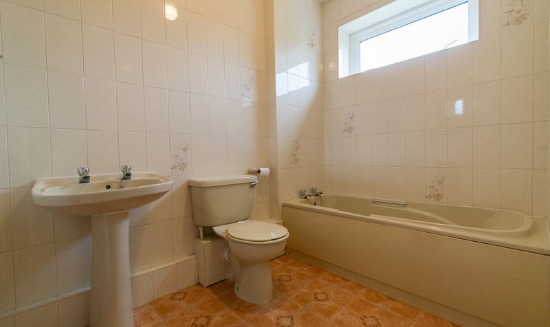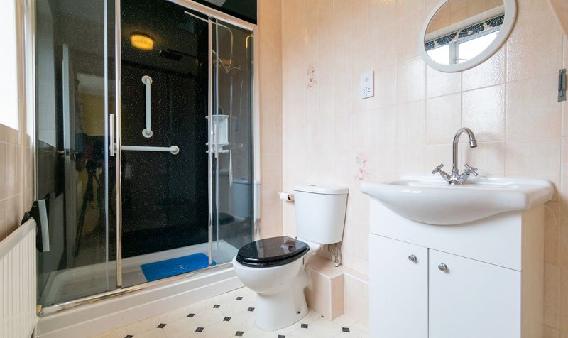 Two bathrooms provide practicality and comfort. The main bathroom is finished with neutral tiling and includes a panelled bath, wash basin, and WC. A second shower room offers a contemporary black-panelled walk-in shower enclosure with fitted grab rails, along with a WC and modern vanity unit, ideal for ease of access and functionality.