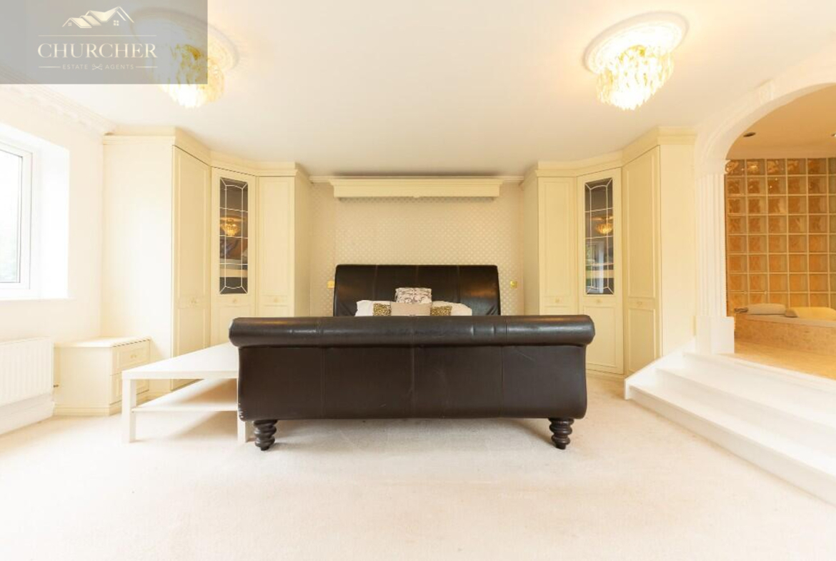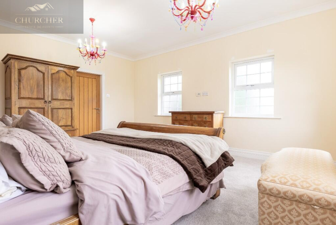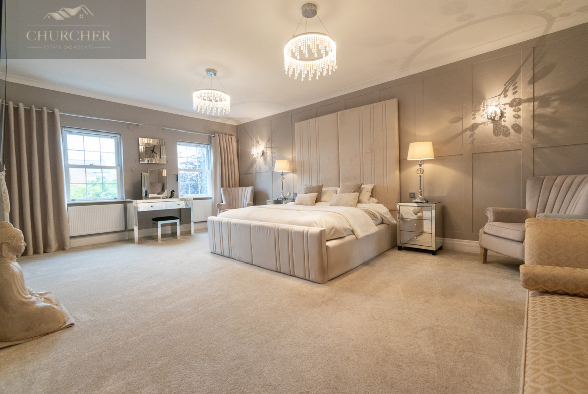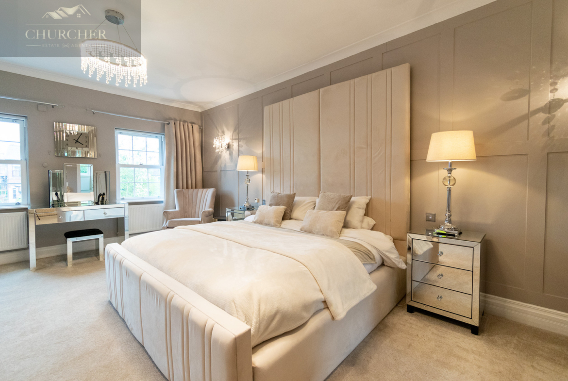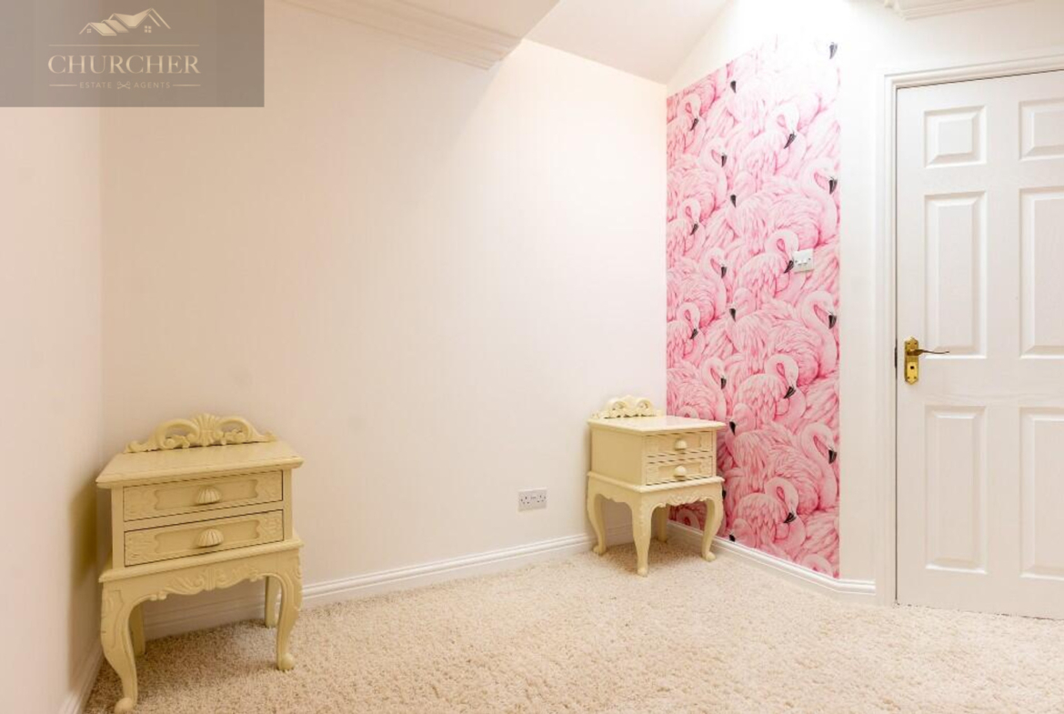 Four additional bedrooms complete the first floor of this substantial home each with its own unique style and character and private en-suite. One of the rooms offers a chic and cosy single setup, ideal as a child’s bedroom or guest space, with soft taupe walls, plush carpet, a mirrored wardrobe and elegant chandelier lighting. Another features a striking sleigh bed set against a delicate floral accent wall, framed by twin sash windows that flood the room with natural light – a charming and serene space with classic appeal. A third bedroom, finished in crisp white tones with silver-grey carpet, enjoys generous proportions, dual aspect windows, and stylish chandeliers, making it feel fresh, bright, and airy – ideal for a teenager or as a second principal suite. Lastly, a fourth room presents a more traditional layout with built-in wardrobes, a dressing table and soft, neutral décor, offering a peaceful setting and excellent storage. Completing the first floor is a private study, perfect for working from home but also easily adaptable as an additional bedroom if needed. For added flexibility, the front lounge on the ground floor could also serve as a spacious bedroom, ideal for multigenerational living or guest accommodation. Each room reflects the home’s balance of elegance, comfort, and practicality.