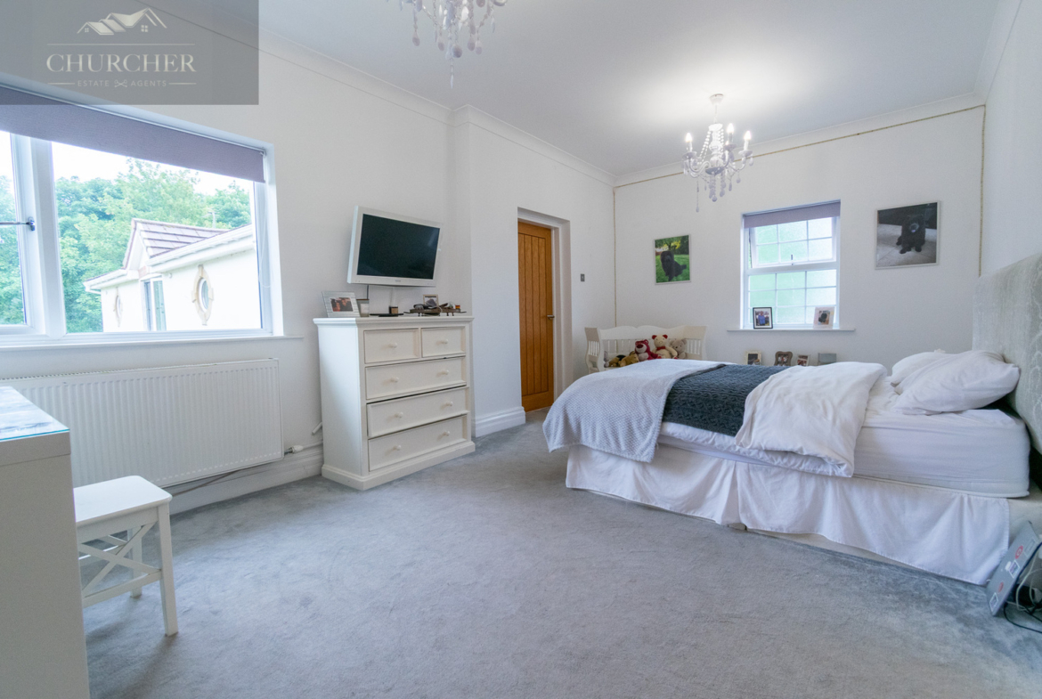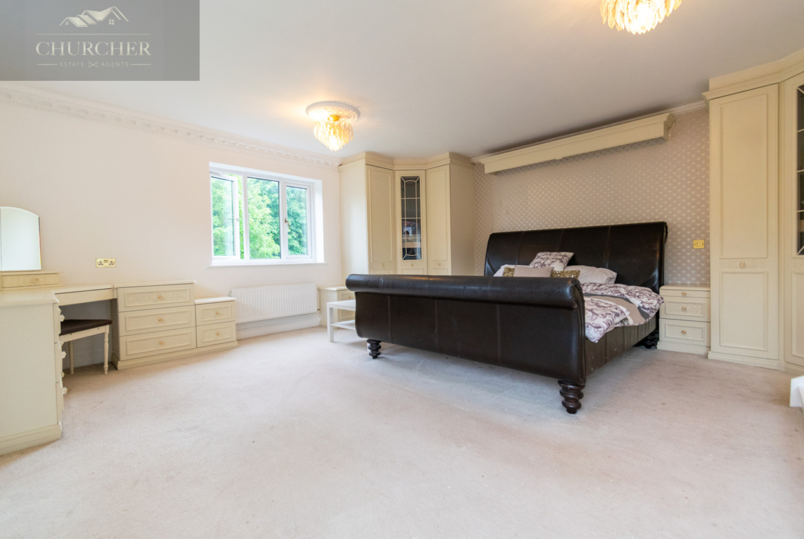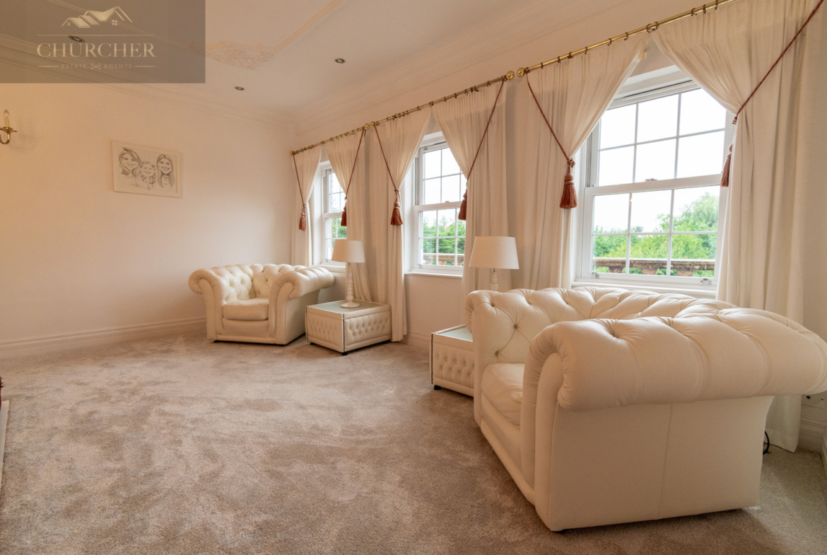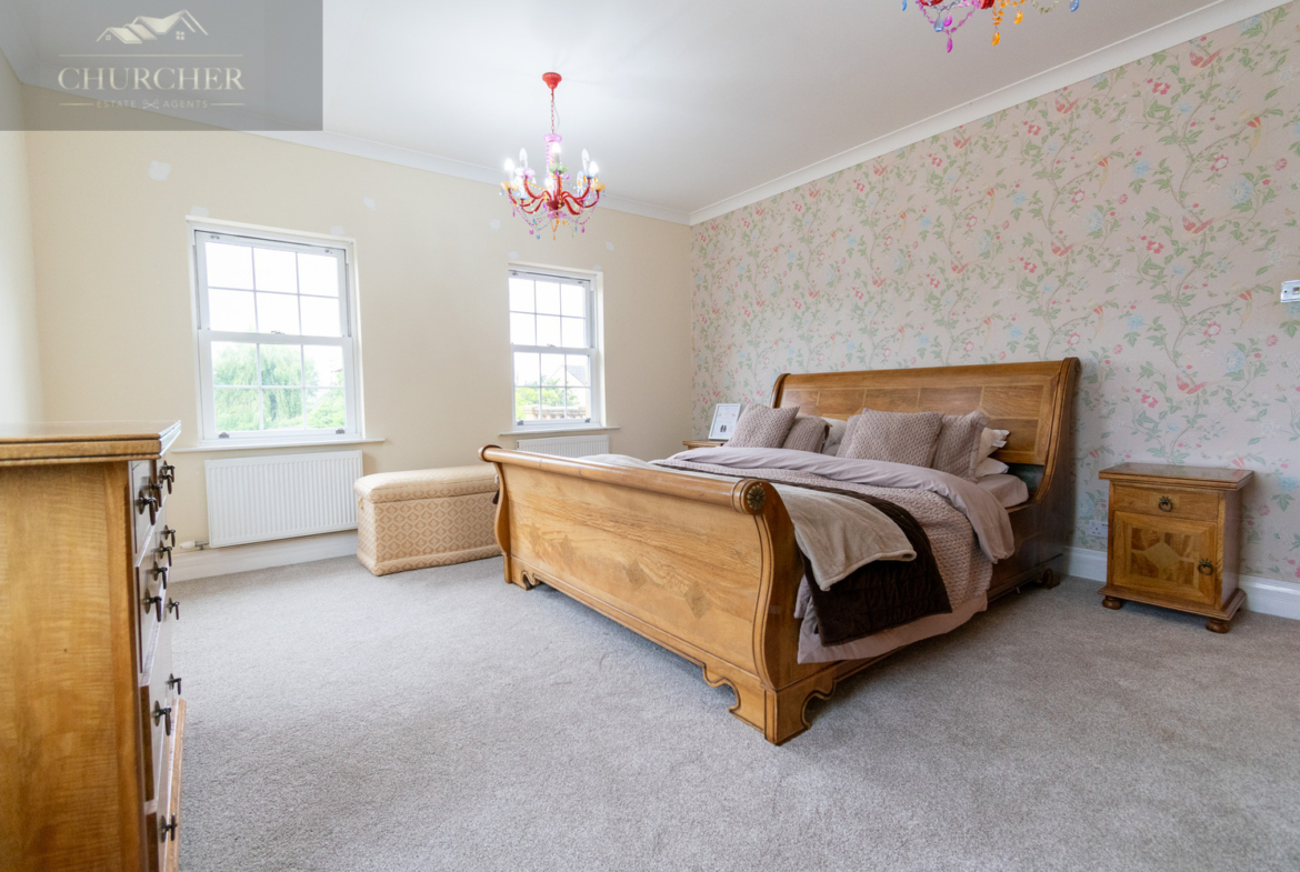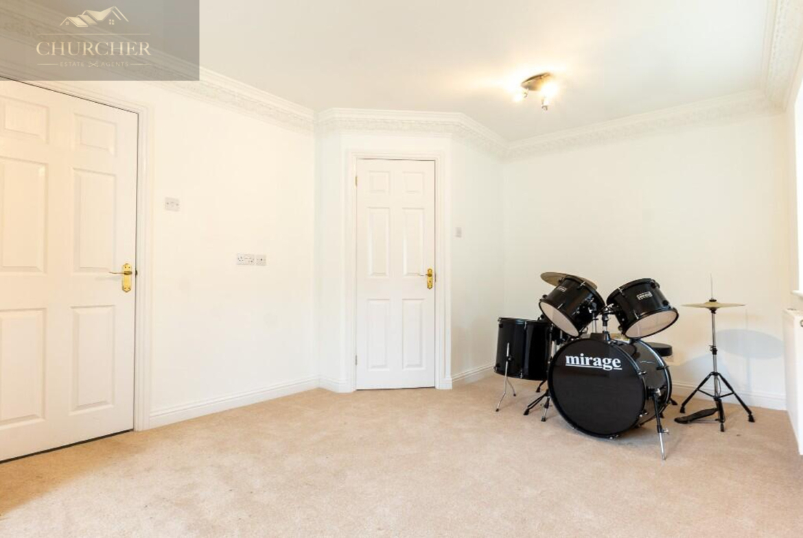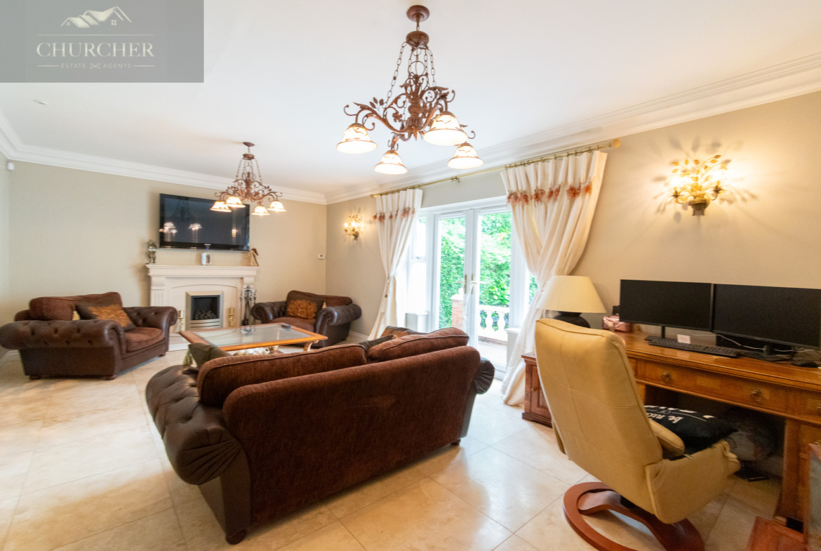 Four additional bedrooms complete the first floor of this substantial home each with its own unique style and character and private en-suite. One of the rooms offers a chic and cosy single setup, ideal as a child’s bedroom or guest space, with soft taupe walls, plush carpet, a mirrored wardrobe and elegant chandelier lighting. Another features a striking sleigh bed set against a delicate floral accent wall, framed by twin sash windows that flood the room with natural light – a charming and serene space with classic appeal. A third bedroom, finished in crisp white tones with silver-grey carpet, enjoys generous proportions, dual aspect windows, and stylish chandeliers, making it feel fresh, bright, and airy – ideal for a teenager or as a second principal suite. Lastly, a fourth room presents a more traditional layout with built-in wardrobes, a dressing table and soft, neutral décor, offering a peaceful setting and excellent storage. Completing the first floor is a private study, perfect for working from home but also easily adaptable as an additional bedroom if needed. For added flexibility, the front lounge on the ground floor could also serve as a spacious bedroom, ideal for multigenerational living or guest accommodation. Each room reflects the home’s balance of elegance, comfort, and practicality.