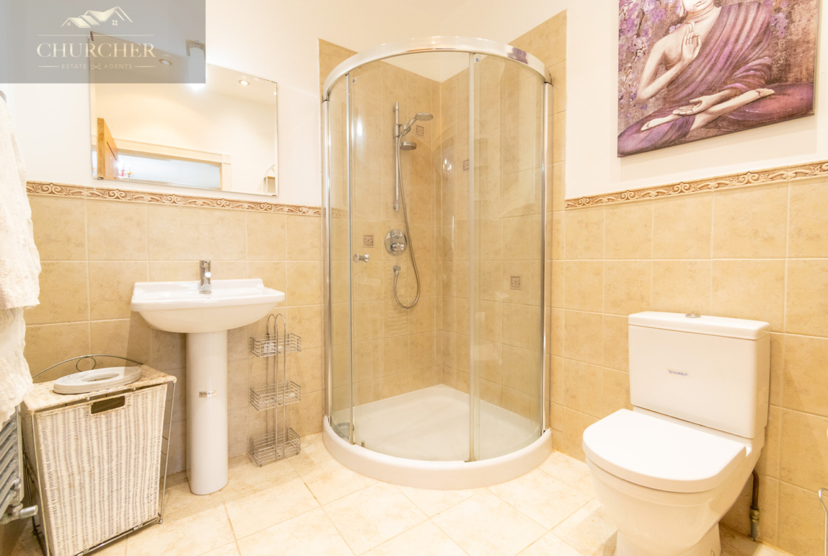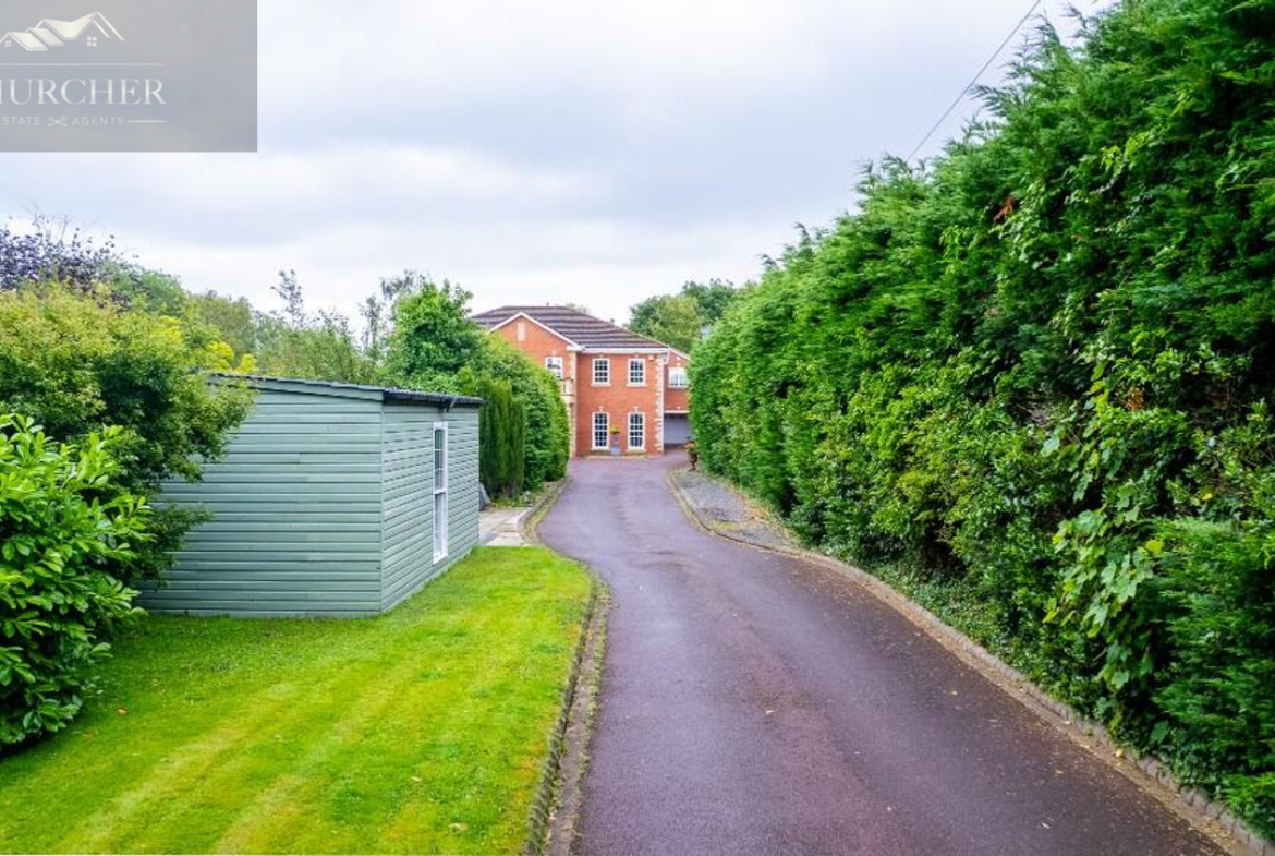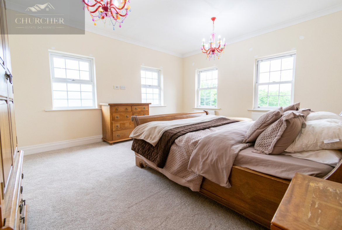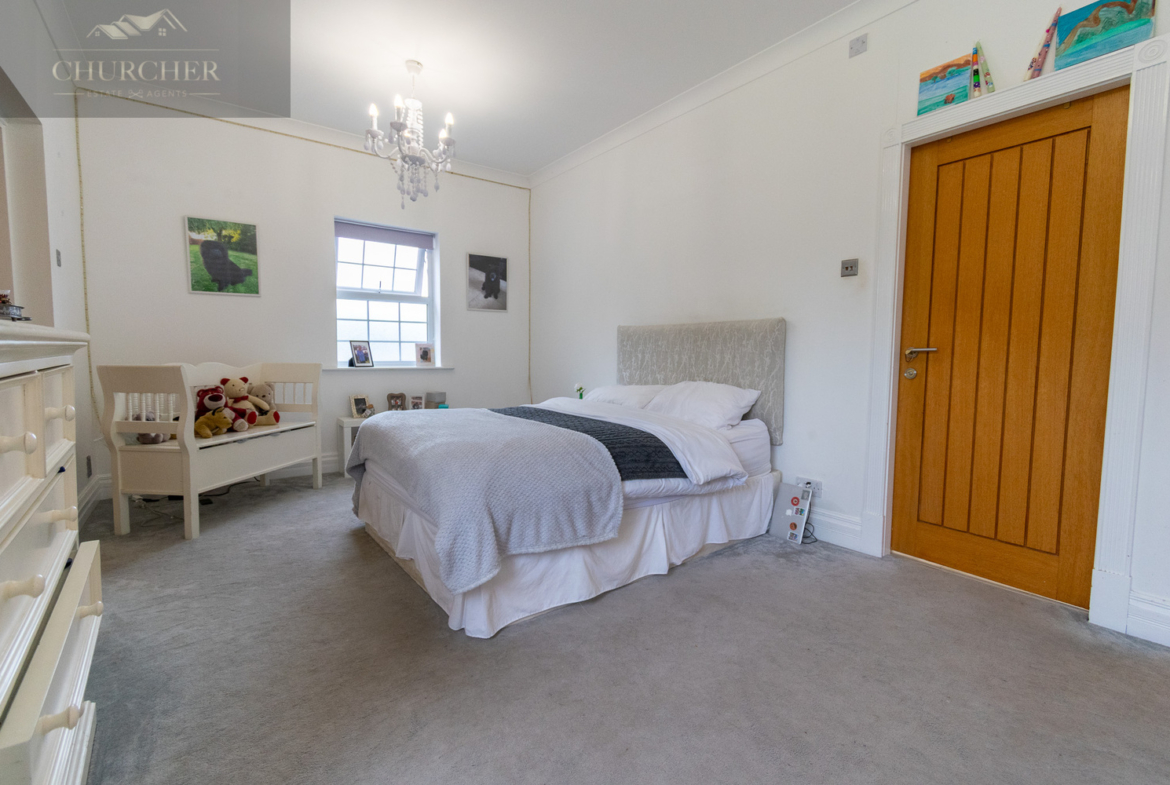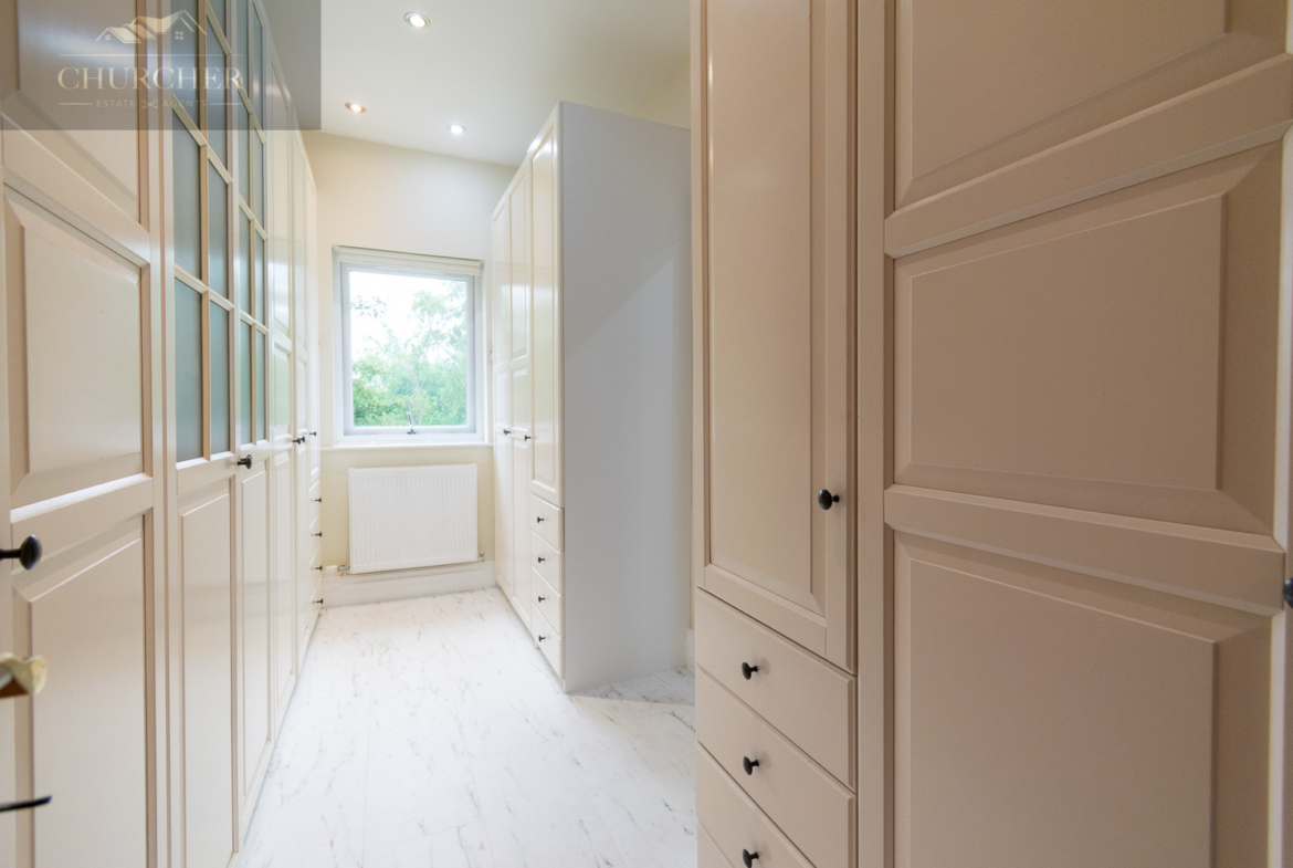Four additional bedrooms complete the first floor of this substantial home each with its own unique style and character and private en-suite. One of the rooms offers a chic and cosy single setup, ideal as a child’s bedroom or guest space, with soft taupe walls, plush carpet, a mirrored wardrobe and elegant chandelier lighting. Another features a striking sleigh bed set against a delicate floral accent wall, framed by twin sash windows that flood the room with natural light – a charming and serene space with classic appeal. A third bedroom, finished in crisp white tones with silver-grey carpet, enjoys generous proportions, dual aspect windows, and stylish chandeliers, making it feel fresh, bright, and airy – ideal for a teenager or as a second principal suite. Lastly, a fourth room presents a more traditional layout with built-in wardrobes, a dressing table and soft, neutral décor, offering a peaceful setting and excellent storage. Completing the first floor is a private study, perfect for working from home but also easily adaptable as an additional bedroom if needed. For added flexibility, the front lounge on the ground floor could also serve as a spacious bedroom, ideal for multigenerational living or guest accommodation. Each room reflects the home’s balance of elegance, comfort, and practicality.