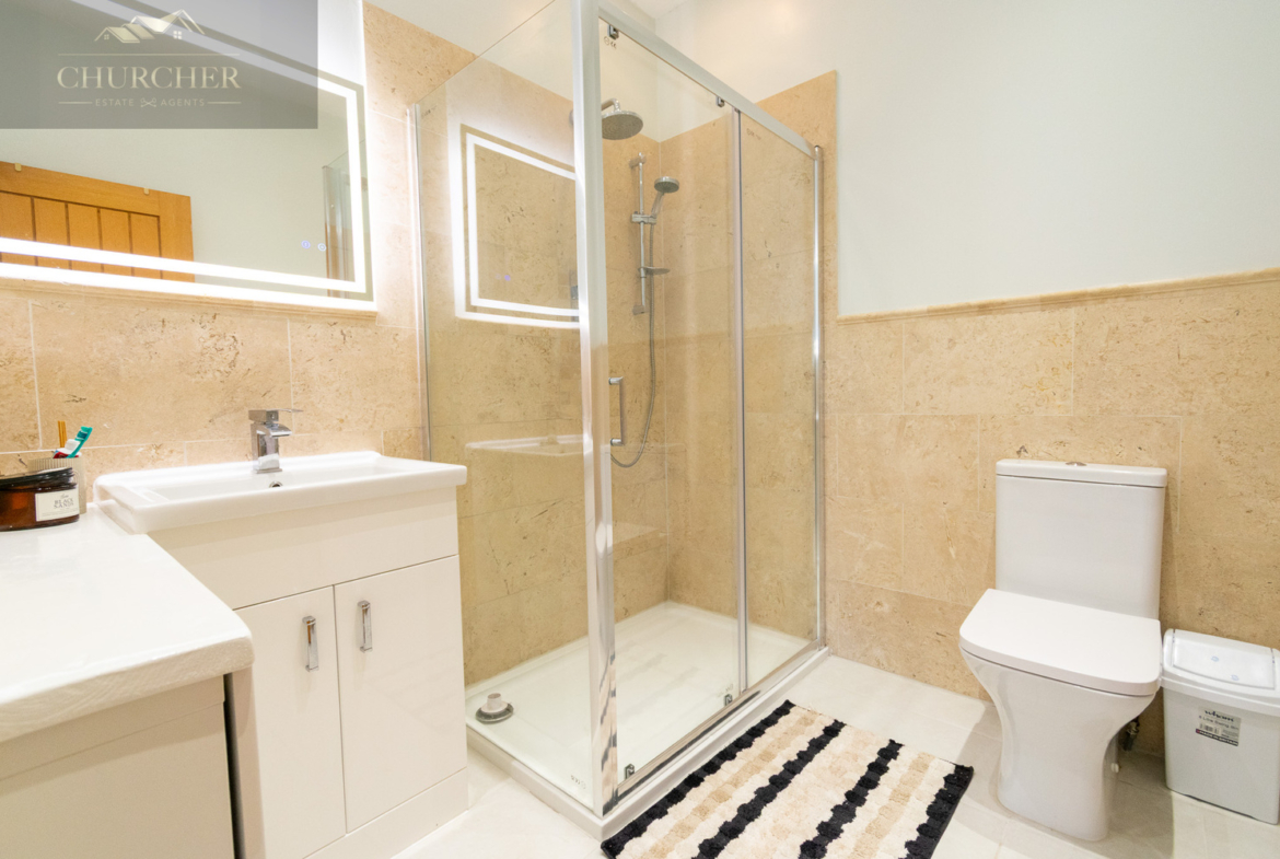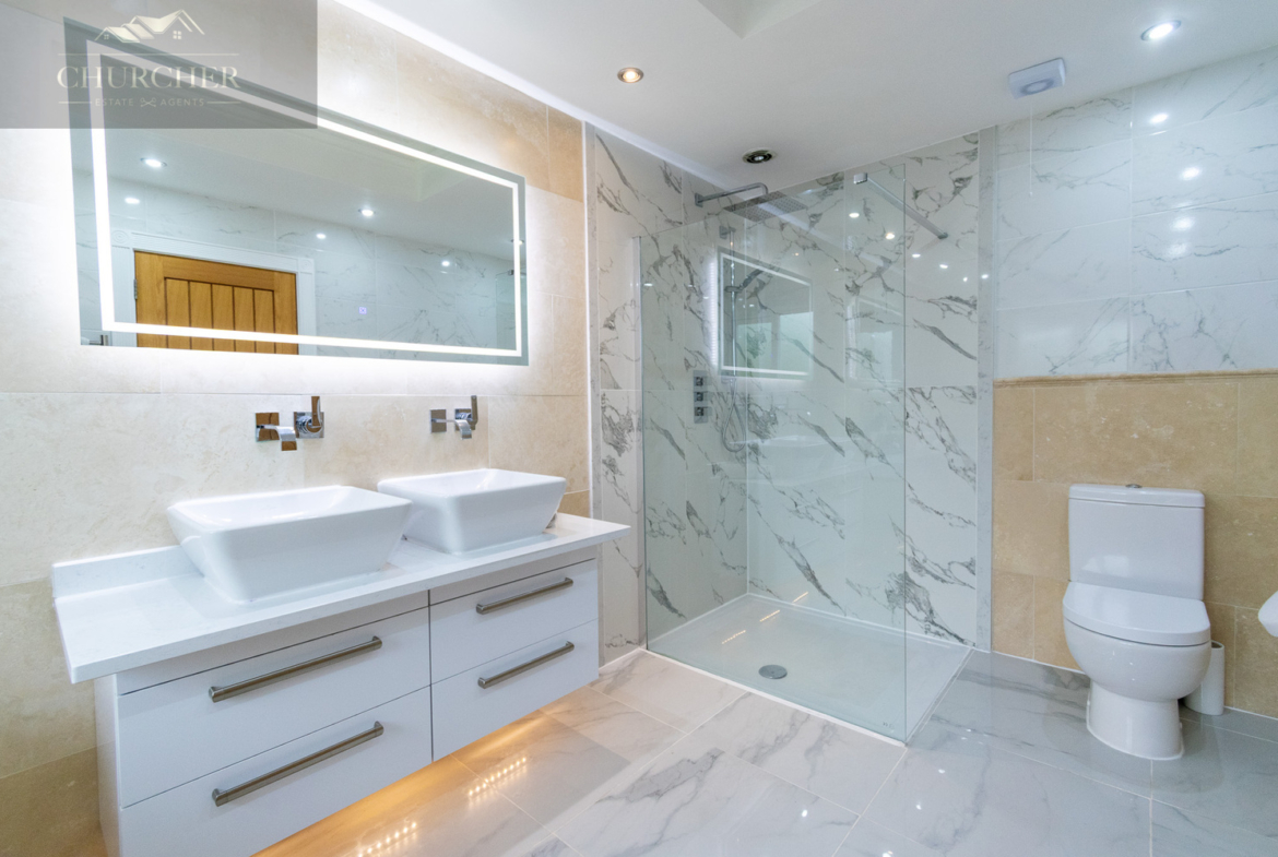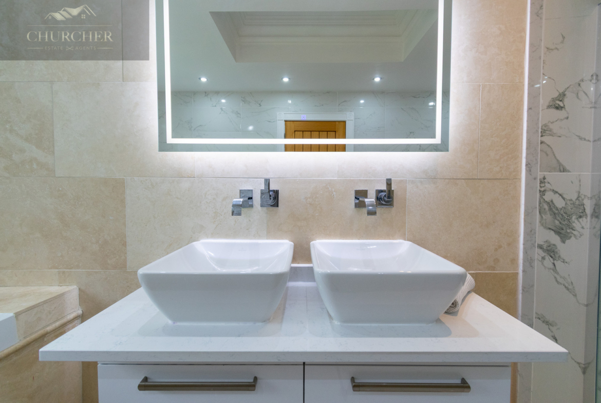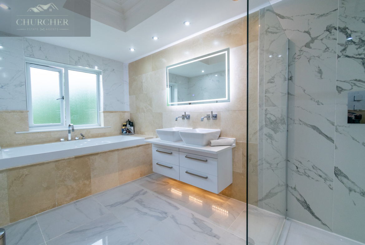 The exquisite en-suite bathroom is a masterclass in spa-inspired design and luxury. Bathed in natural light from a frosted-glass window, the space is adorned in polished marble-effect tiles and sleek neutral tones. A stunning floating double vanity unit with square countertop basins and integrated under-lighting sits beneath a large, illuminated mirror, creating a sense of modern opulence. The walk-in rainfall shower is enclosed in seamless glass and finished with contemporary chrome fixtures and contrasting marble wall tiling. A deep-set bath, positioned beneath the window, offers a serene spot to unwind. Every detail has been considered, resulting in a space that is as functional as it is elegant.