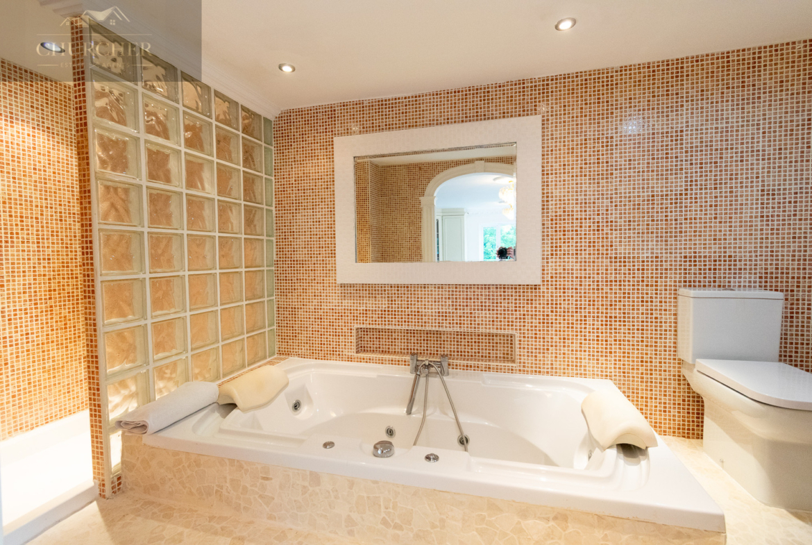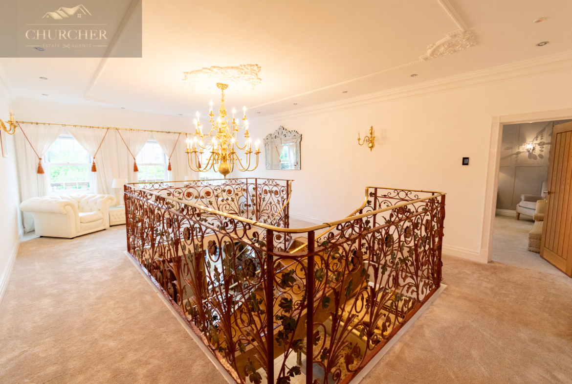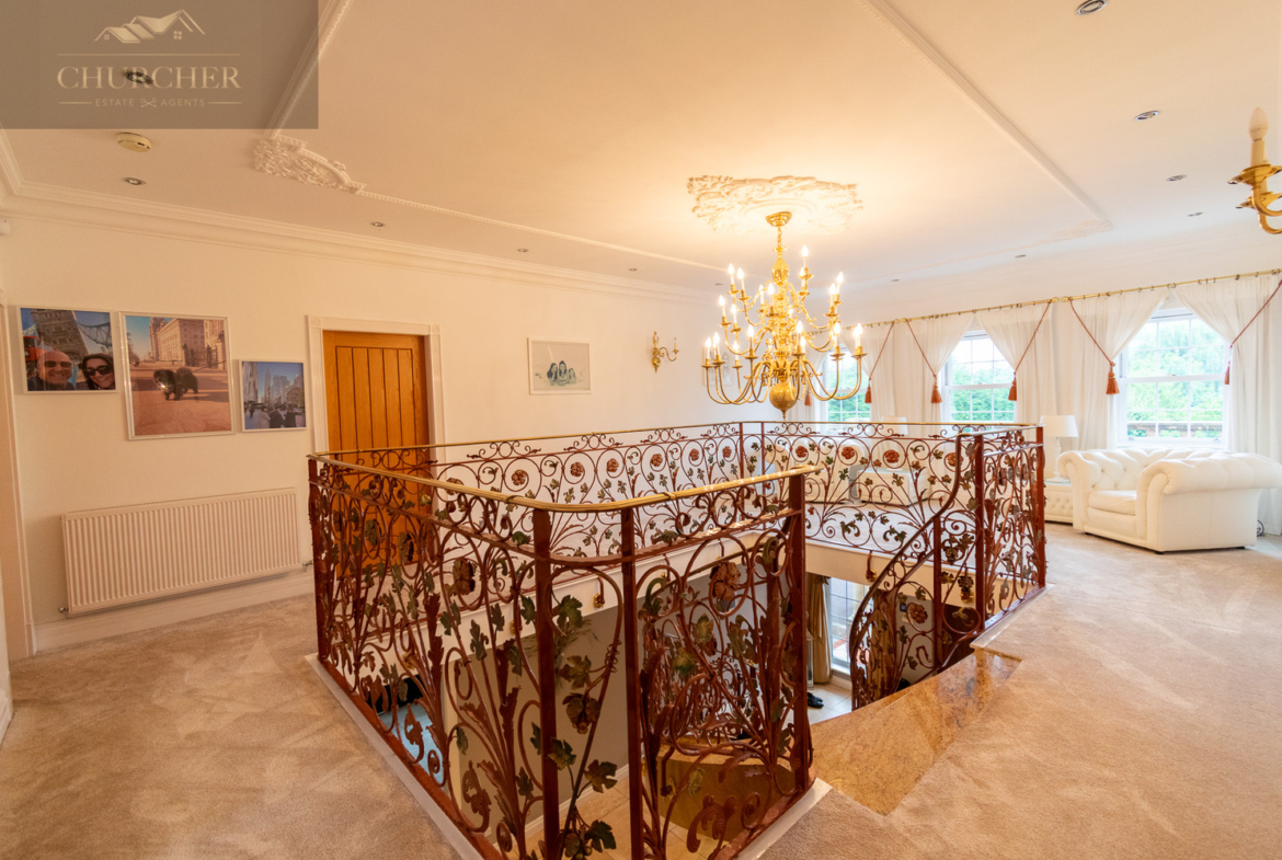 Ascending the grand staircase, you arrive at a magnificent galleried landing – a striking space that reflects the home’s sense of scale and elegance. Framed by intricately designed wrought iron balustrades with gold accents, the landing feels more like an additional reception area than a hallway. Bathed in natural light from multiple windows, it offers a calm and inviting atmosphere, with ample room for seating or display furniture. From here, you can appreciate the symmetry of the home’s layout while enjoying elevated views over the grand entrance hall below and the landscaped frontage beyond.