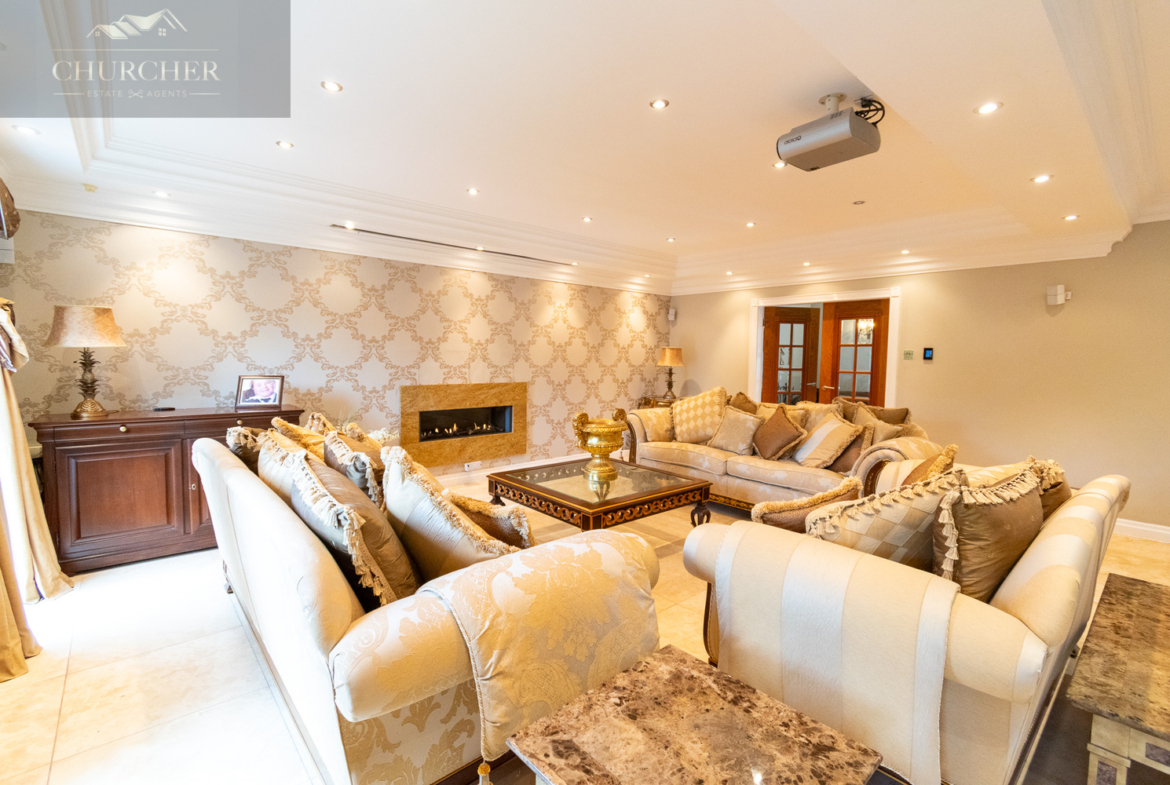 Another reception room is also located on the ground floor which combines classical charm with everyday functionality, featuring a traditional fireplace with a stone-effect surround and wall-mounted TV as its central focal point. Rich Chesterfield-style sofas and armchairs provide luxurious comfort, while polished stone flooring and soft taupe walls create a warm, neutral palette. Ornate chandeliers and wall sconces offer ambient lighting, and full-height French doors dressed in cream and peach curtains open onto the rear terrace, inviting in natural light. A dedicated home office area with a wooden desk and dual monitors adds practicality, making this a versatile space for both relaxation and remote working.