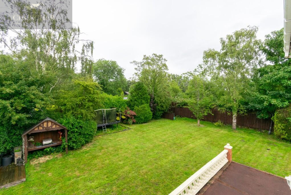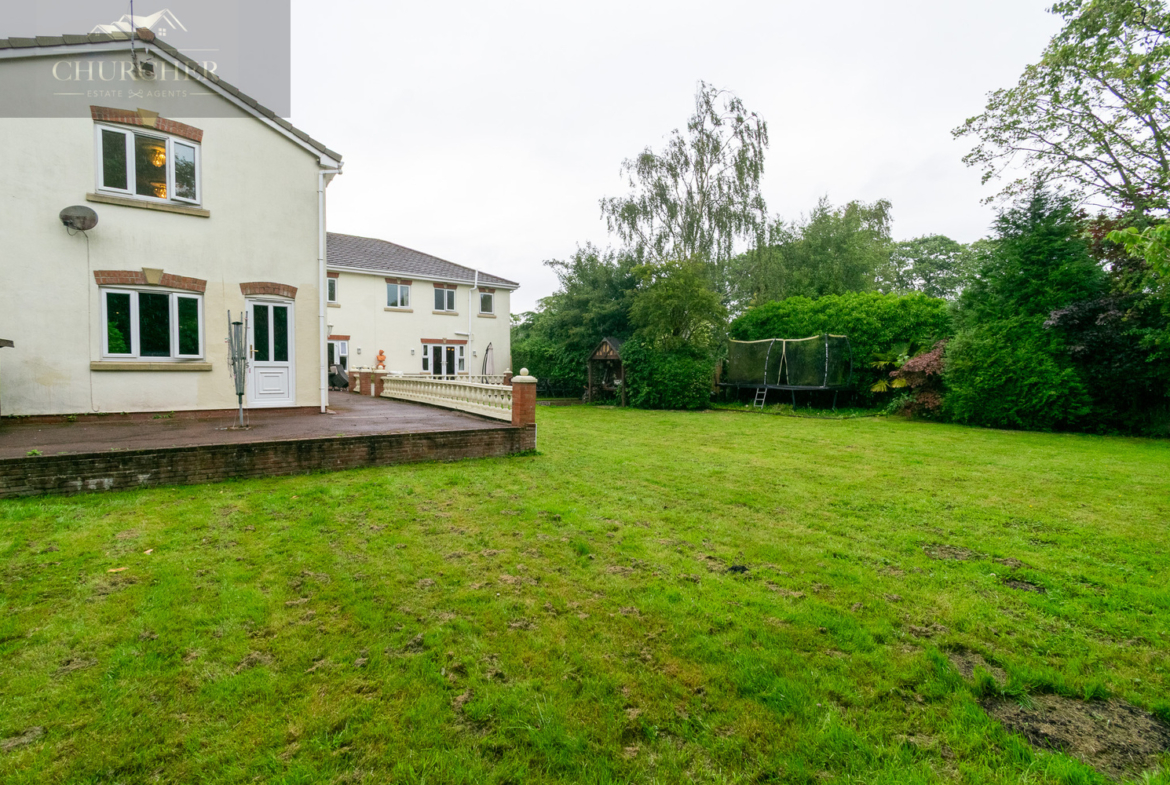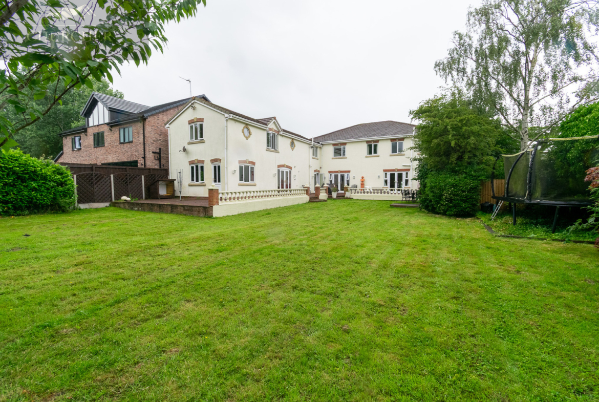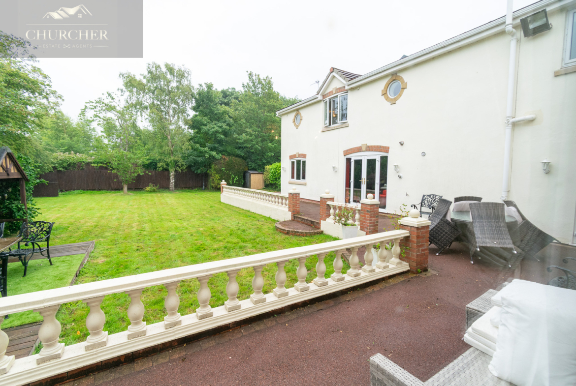 The rear garden is a private and beautifully landscaped retreat, designed for both relaxation and entertaining. A large stone patio runs the full width of the house, providing an ideal space for alfresco dining and summer gatherings, while elegant balustrades and steps lead down to a generous lawn bordered by mature trees and manicured hedging for added seclusion. The garden enjoys a peaceful backdrop of greenery, offering a real sense of tranquillity, and there’s ample room for children to play or for the addition of garden structures if desired. Thoughtfully planted beds, ambient lighting, and well-maintained pathways complete this exceptional outdoor space, which perfectly complements the grandeur of the home.