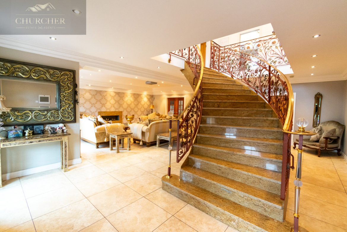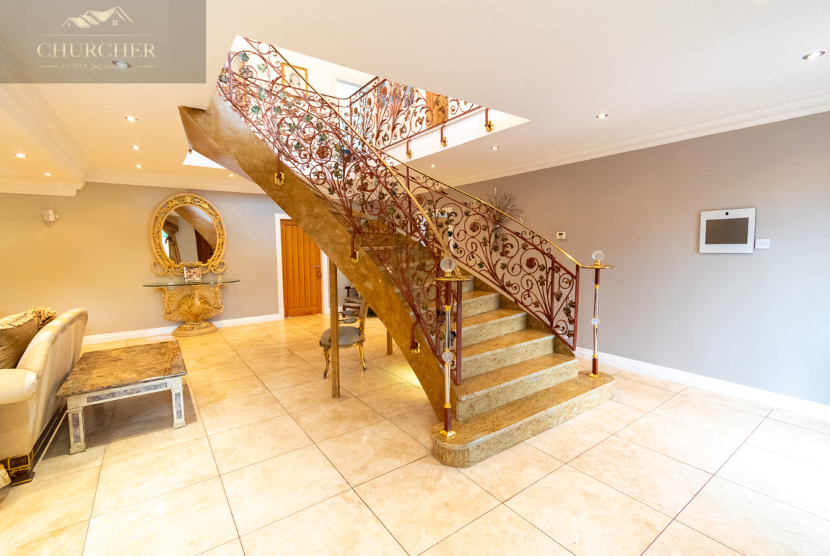 From this central space, your eye is drawn to the dramatic staircase – a true centrepiece of the home. Sweeping upwards in a graceful curve, the staircase features polished granite steps and exquisitely detailed wrought iron balustrades with floral motifs, finished with gold accents. Overhead, a spectacular chandelier hangs above the galleried landing, providing a stunning visual link between the two floors. This staircase is not only a practical connection between levels but a showstopping architectural feature in its own right, setting the tone for the luxury that continues throughout the rest of the home.
