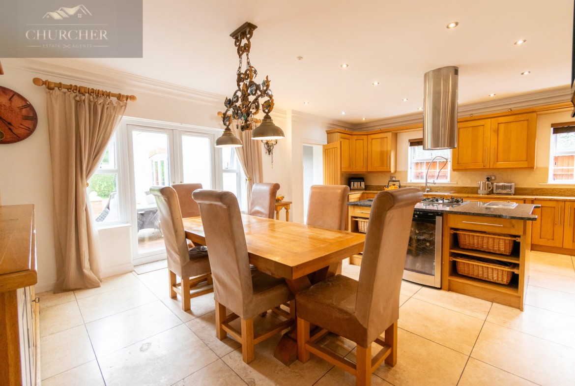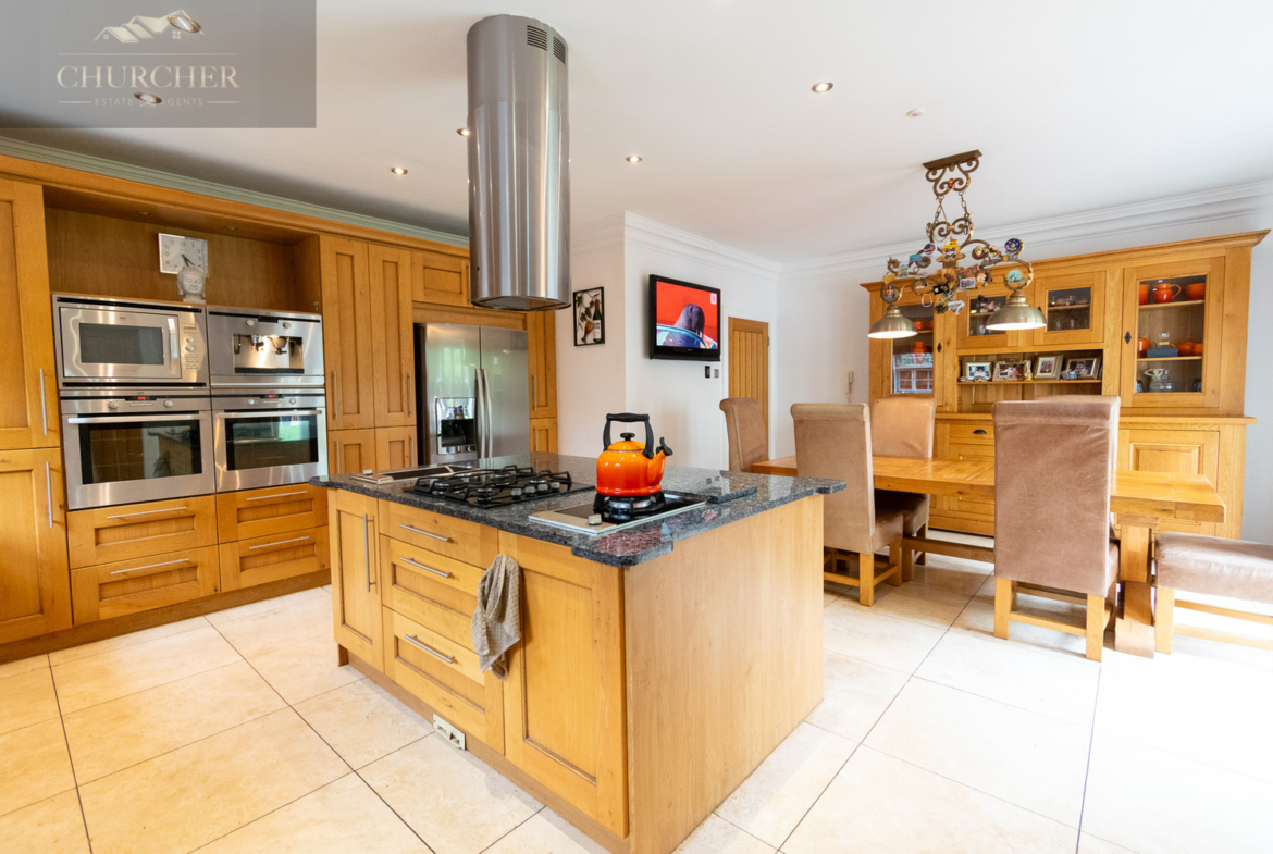 Also off the reception room is the open plan kitchen/ diner. The kitchen itself is fitted with an extensive range of bespoke oak cabinetry, offering ample storage. The granite worktops provide a luxurious finish, perfectly complementing the cream tiled flooring and neutral palette. A large central island sits at the centre of the room, topped with matching granite and fitted with a five-ring gas hob and integrated wine cooler – an ideal setup for sociable cooking or casual breakfasts. Integrated appliances are seamlessly built-in, including a double oven, American-style fridge freezer, dishwasher, and microwave, while stylish downlights and over the island add ambiance and focus. The proportions of the room allow for a large family dining table with space to spare, and the current layout features a generous informal dining area beneath contemporary lighting, making it perfect for both daily meals and more formal dinner occasions.