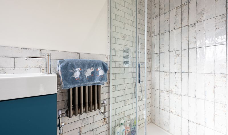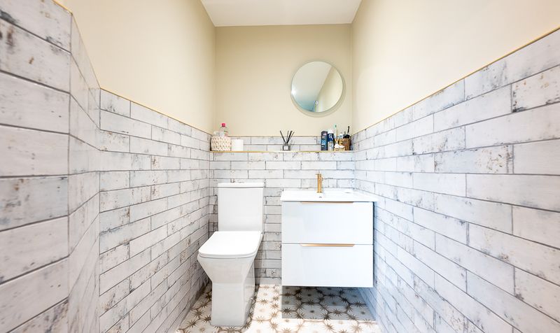 Three further well-proportioned double bedrooms are served by a stylish and contemporary family bathroom, finished to a high standard throughout. The space features a panelled bath with wall-mounted taps and overhead shower, alongside a separate glazed shower enclosure, offering both practicality and convenience for busy family life. A sleek wall-mounted vanity unit with inset basin provides useful storage beneath, complemented by a modern WC and chrome heated towel rail. Striking wood-effect panelling to half height adds warmth and texture, beautifully balanced by neutral upper walls and patterned flooring. Subtle feature lighting enhances the ambience, creating a bathroom that feels both luxurious and inviting.