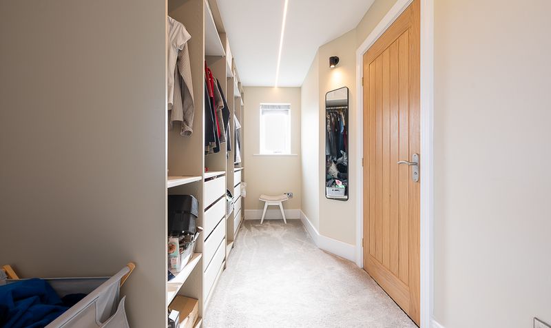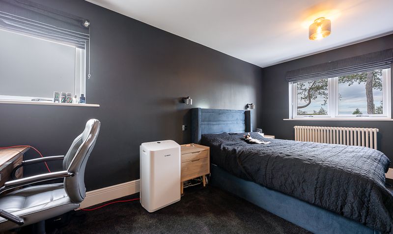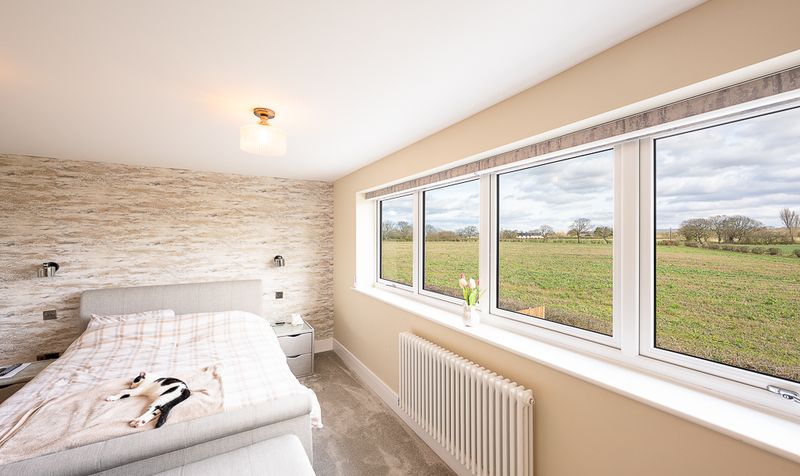 To the first floor, the sense of space continues. The principal bedroom enjoys elevated views across open fields and benefits from a walk-in wardrobe and stylish en-suite shower room.