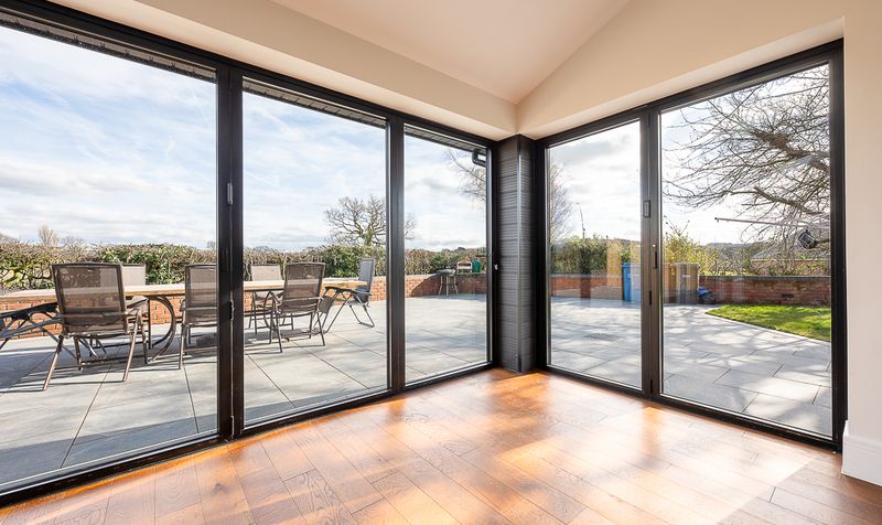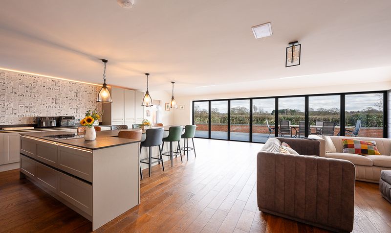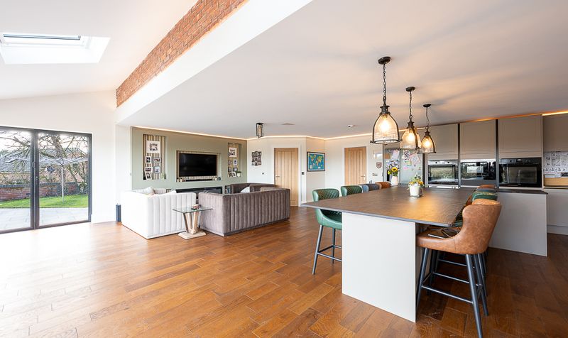 To the rear, a generous dining and lounge area overlooks the garden, ideal for both everyday living and entertaining on a larger scale. Expansive glazing and bi-folding doors span the rear elevation, opening fully onto the patio to create a seamless indoor-outdoor experience with uninterrupted countryside views. A roof lantern floods the space with natural light, while warm wood flooring runs throughout, enhancing the cohesion and quality of this exceptional family living area.