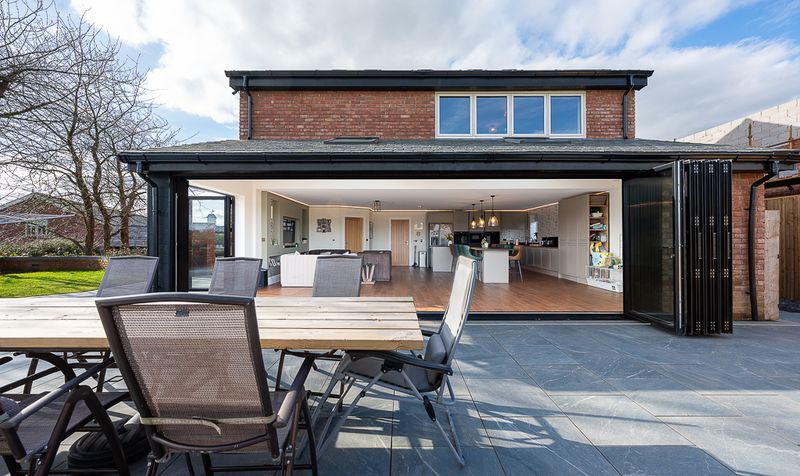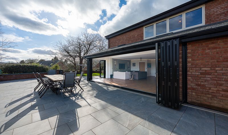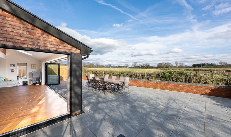Externally, the rear garden has been designed for low maintenance and maximum enjoyment. A vast porcelain patio stretches across the rear of the home, providing multiple seating and dining areas, all perfectly positioned to take in the open rural aspect beyond the boundary wall. The bi-folding doors allow the kitchen and terrace to function as one expansive entertaining space during the warmer months, making this home particularly well suited to hosting. In addition to the patio, a generous lawned area to the side offers further outdoor space, ideal for children, pets or simply enjoying the peaceful surroundings.