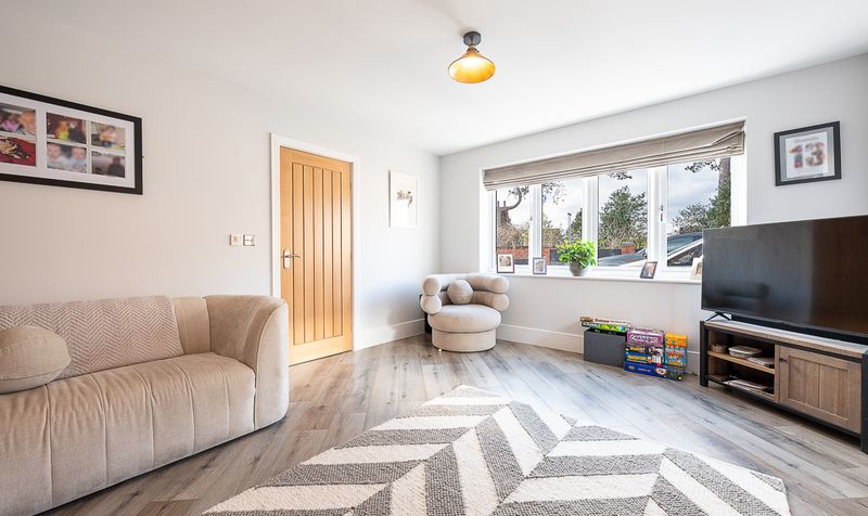 To the front elevation, a separate lounge offers a more intimate and inviting retreat, beautifully blending character features with contemporary styling. A striking stone fireplace with inset log-burning stove forms the focal point, creating a cosy setting ideal for quieter evenings. Soft neutral décor enhances the light and spacious feel, while an eye-catching feature wall adds depth and personality. Generous proportions comfortably accommodate multiple sofas, making the room equally suited to relaxed family time or more formal gatherings, with dual windows drawing in plenty of natural light and complementing the light wood-effect flooring.